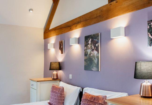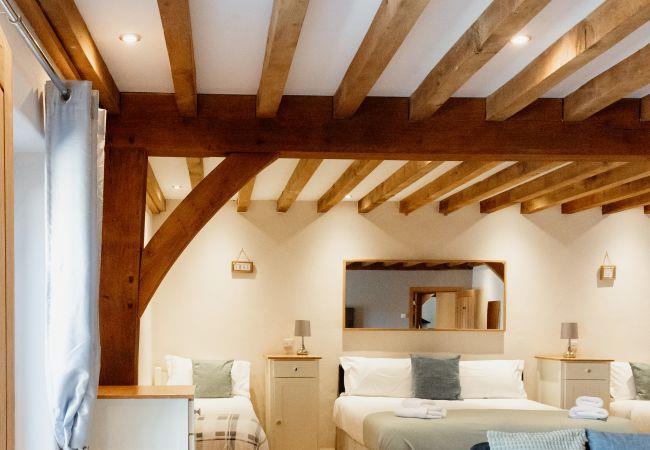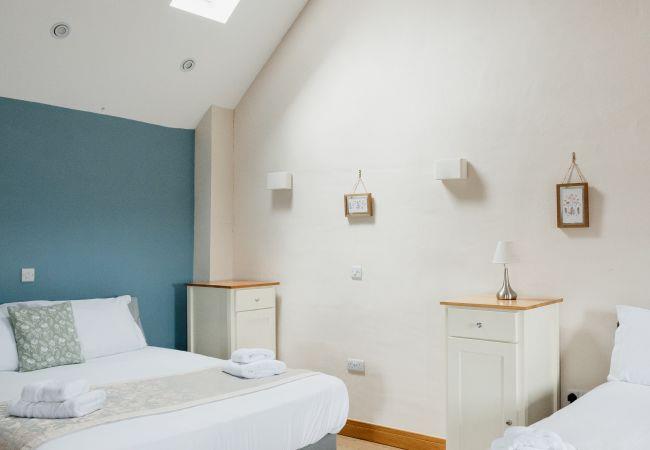 Heather Suite – First floor. 1 Super King (Zip & link, twin upon request), 3 singles, and sky light above the double bed perfect for cloud watching or star gazing. Seating area, SMART TV. Private en suite wet room bathroom. (Sleeps 5)