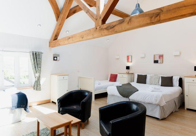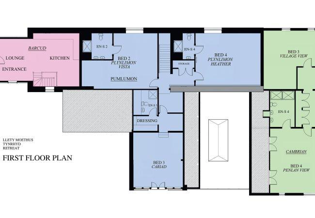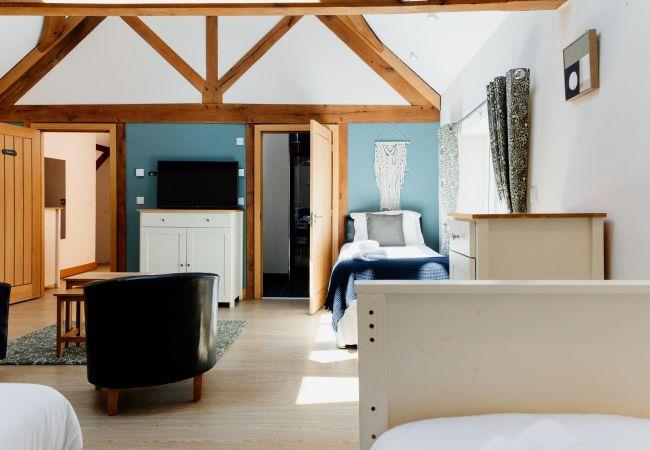 Penlan Suite – First floor. 1 Super King bed (Zip & link twin on request), 4 Singles. Seating area, SMART tv. Private en suite has twin showers and sinks. (Sleeps 6)