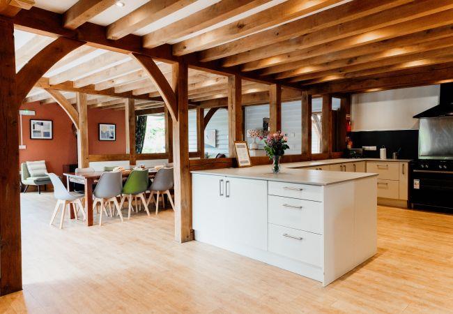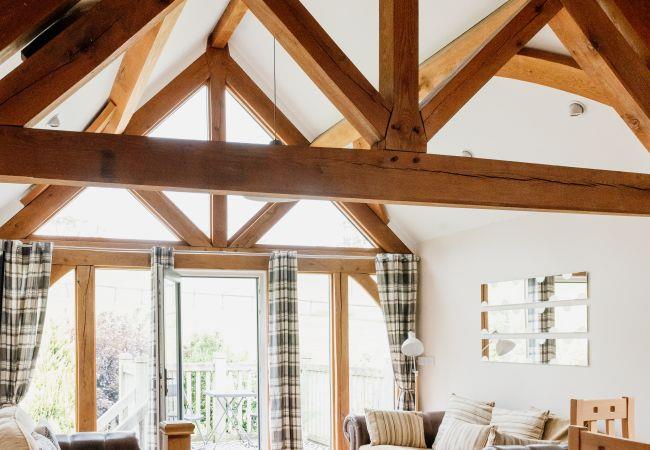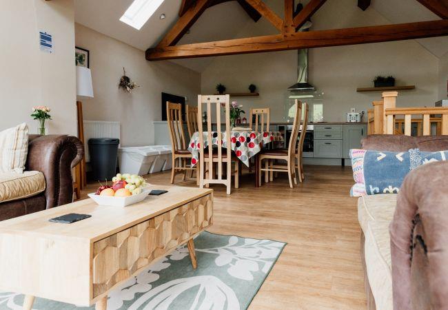 Enter a spacious open plan living, dining and kitchen area with high vaulted ceilings, beams and meadow views. In your fully equipped kitchen-diner with electric hob/oven range, microwave, fridge, freezer, dish washer and washer/dryer, you will find everything you need to enjoy your home cooking and a dining area for 5.