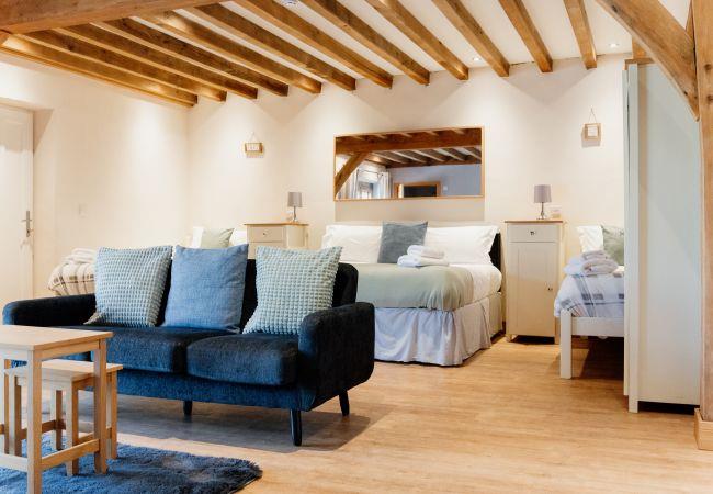 In fresh and colourful décor, the size and style of the living area is ideal for your entire family or group of friends to curl up in. Snuggle on plush sofa’s flanking the log burner and break out the board games. For the big match or movie nights, there is a SMART TV. French doors lead out to the patio and drinks before dinner or a lazy summer barbecue.