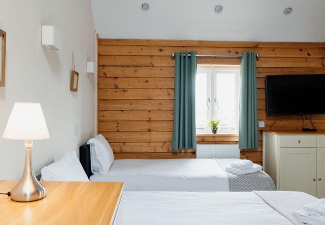 Isaf Suite – Ground floor. 1 Super King bed (Zip & link, twin upon request), 2 singles. Private en suite wet room bathroom. Seating area, SMART TV. (sleeps 4)