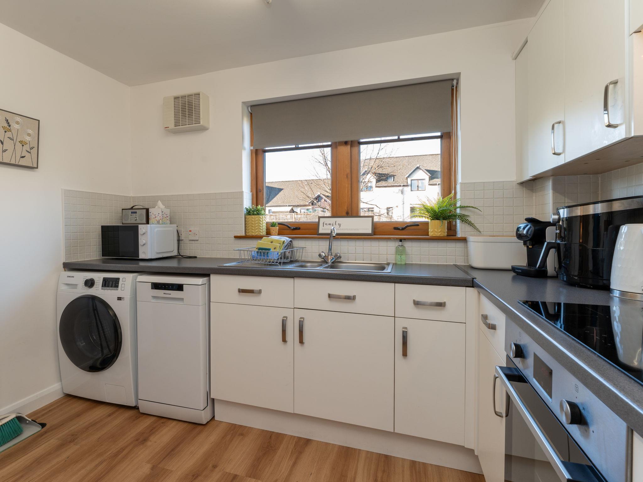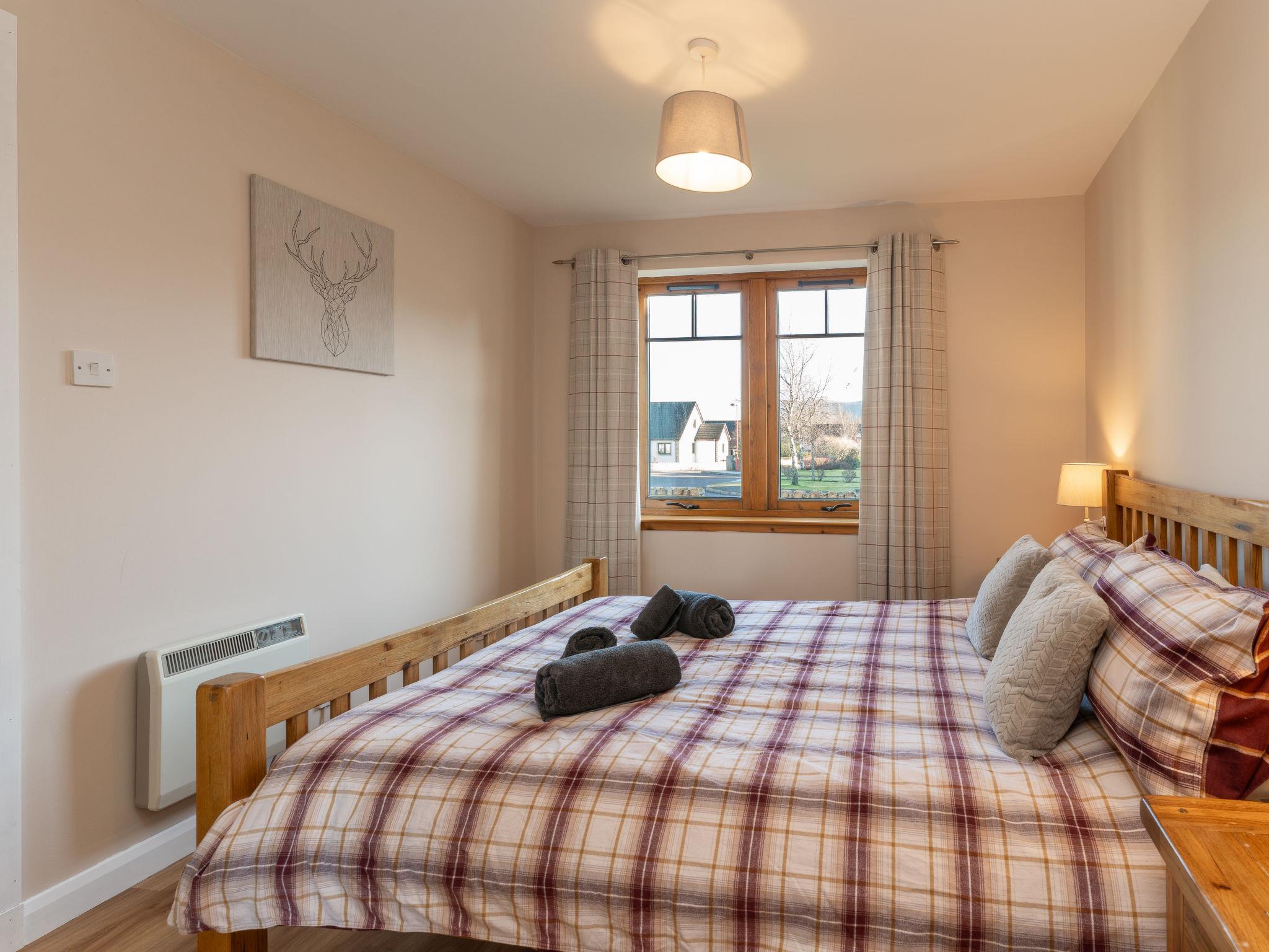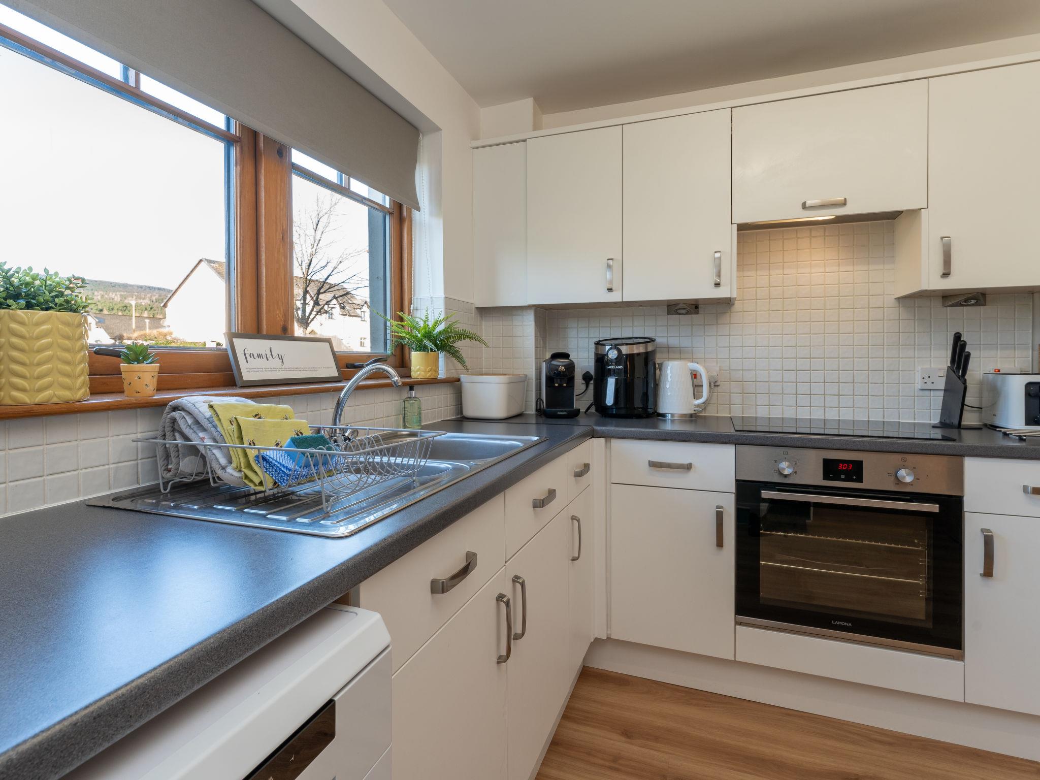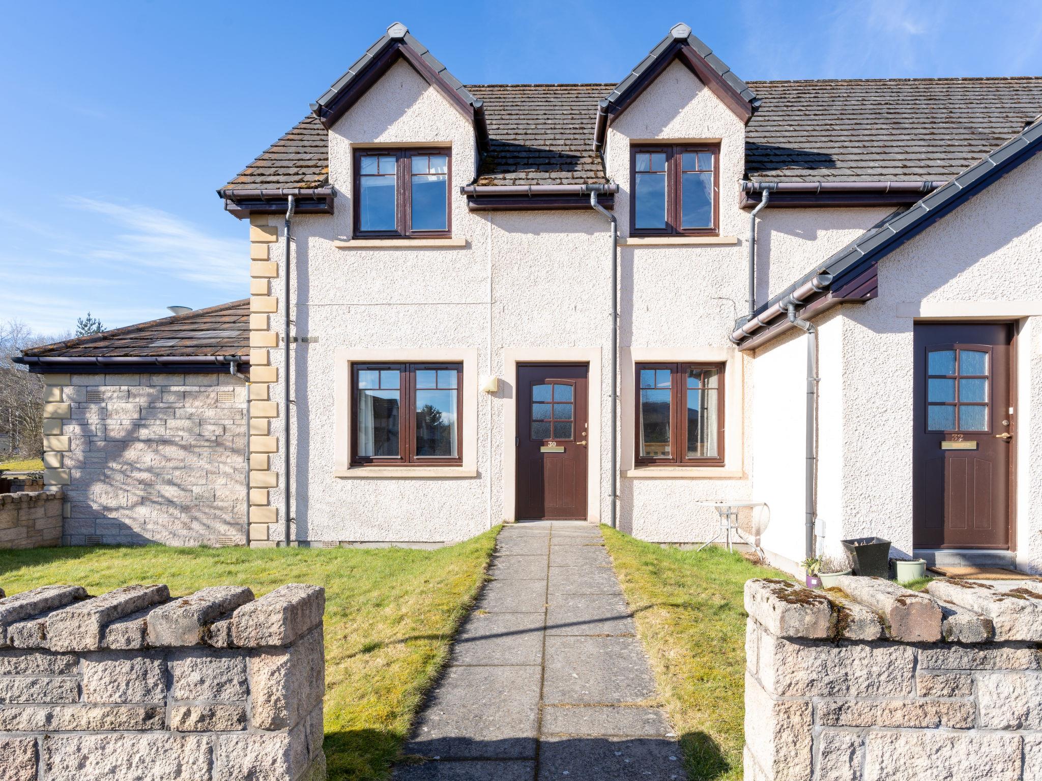 Cosy, comfortable apartment house "The Bruach". 2 km from the centre of Aviemore, in a quiet, sunny position, 15 km from the lake, 18 km from the skiing area, in a cul-de-sac. In the complex: storage room for bicycles, storage room for skis. Parking at the house, public parking. Shop 100 m, grocery, supermarket 1 km, restaurant 1 km, bar 1 km, bus stop "Aviemore (burnside rd)" 450 m, railway station "Aviemore" 2 km. Golf course (18 hole) 1 km, ski lift 18 km. Nearby attractions: Dalfaber Golf & Country Club 1 km, Cairngorm National Park, Highland Wildlife Park 15 km, Inverness 48 km, Landmark Forest Adventure Park 9 km, Highland Folk Museum 27 km. Well-known ski regions can easily be reached: Cairngorms ski resort 18 km, The Lecht ski resort 54 km. Well-known lakes can easily be reached: Loch Morlich 15 km, Loch Garten 14 km, Loch Ness 69 km. Please note: car recommended.