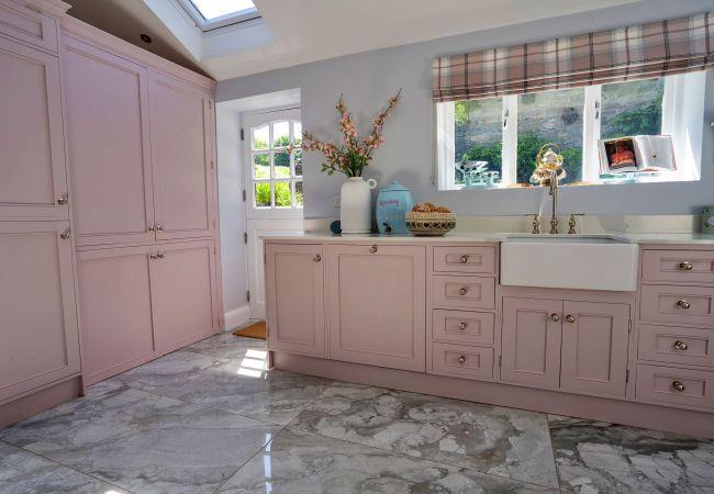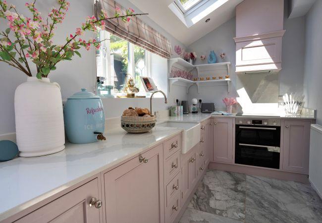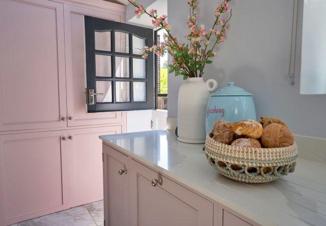 This beautifully restored gem is light and airy, with a cute Dutch door leading to a private walled garden patio, whether you want morning coffees in the sunshine or al fresco dinners under the stars. Inside, the kitchen's all set up for whipping up delicious meals, with soft pink cabinets and sleek countertops that make cooking a joy. In the living room, plush sofas and a rocking chair make for a perfect relaxing evening after a day of adventure.