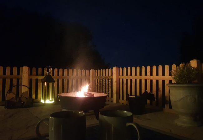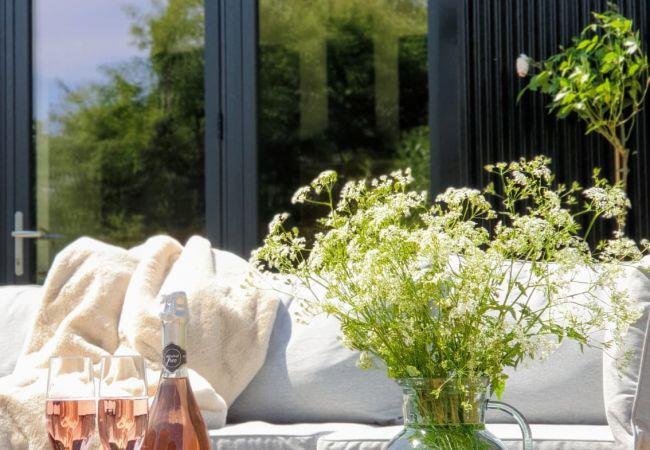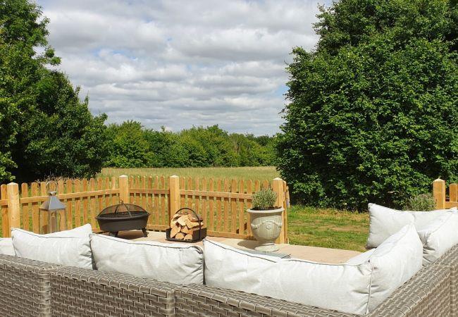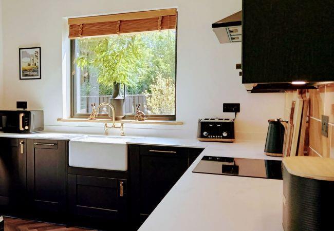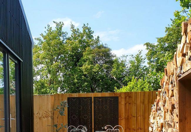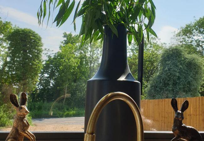 In the lounge you’ll find a touch of luxury style as you take in views of the countryside and woodland as you snuggle on the divine velvet sofa and arm chair. It’s fully equipped with a digital TV and sound doc for you to relax with. Doors open onto the generous Indian sandstone patio with stylish rattan garden sofa to spend a lazy day with a book on. When evening comes you can light the firepit and toast some marshmallows or use its grill to BBQ dinner. The patio can be safely enclosed so small children won’t wander off while you’re relaxing.