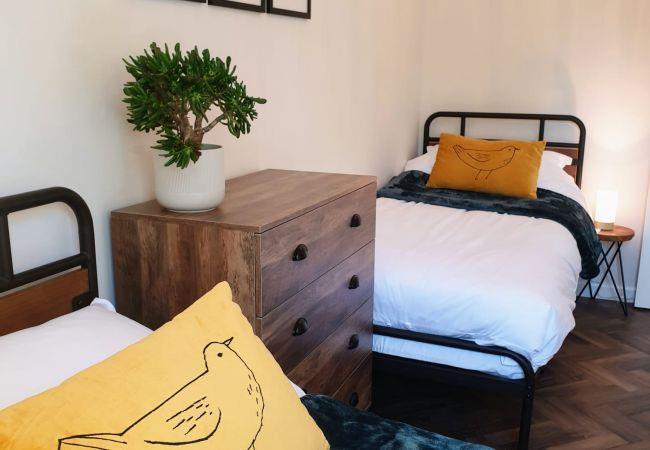 The twin room is fully furnished with style elements of industrial design blended with natural images and shapes. It has two comfortable single beds, a set of draws and side tables. In this room the curtains are lined with blackout fabric to help any younger guests sleep well.