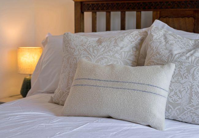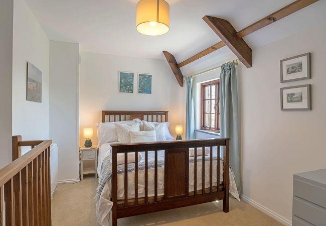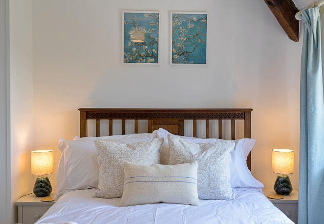 Upstairs, the tranquil double bedroom boasts soft linens and a traditional wooden bed frame. The room is bathed in natural light from the window, which frames views of the surrounding countryside. Thoughtful touches like bedside lamps and botanical prints create a calming, restful space.