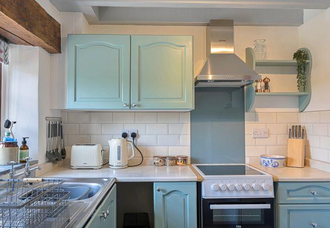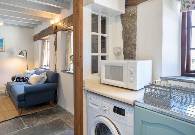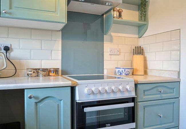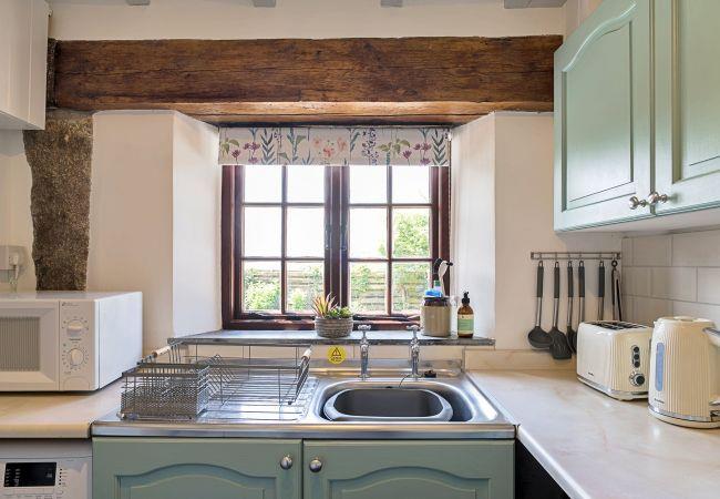 The adjoining kitchen is charmingly appointed with classic country charm. It’s fully equipped with a modern electric cooker, toaster, kettle, and ample cooking utensils – perfect for preparing a leisurely breakfast or a romantic dinner after a day out walking on the moor or exploring the Cornish coast.