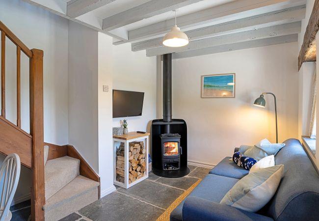 Step into the inviting lounge, where original slate flooring, and a contemporary wood-burning stove create a warm and cosy atmosphere. A comfortable sofa, soft lighting, and tasteful coastal artwork add to the serene and stylish feel.