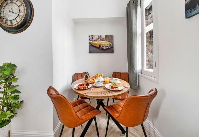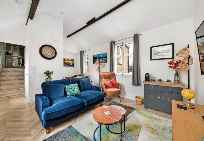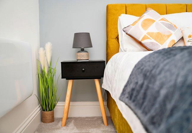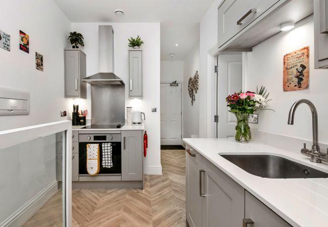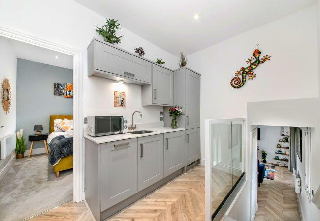 A beautiful one-bedroom apartment situated in the historic town of Boroughbridge, North Yorkshire. A perfect retreat for two, the split-level apartment comprises a contemporary styled lounge, with dining table to seat up to four. Smart TV and Wi-Fi are included during your stay, creating a peaceful retreat for the end of any long day. You’ll find a bright and stylish space throughout with modern fixtures and fittings with personal touches added through the ornaments and wall décor. The upper-level elegant kitchen includes all desired comforts including dishwasher, oven, hob fridge, freezer, and microwave.