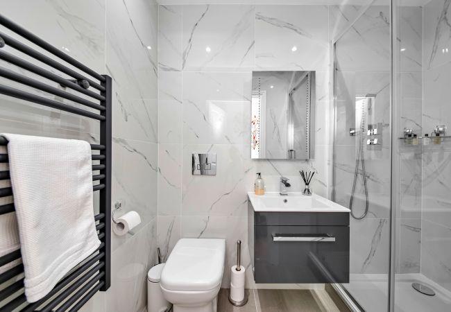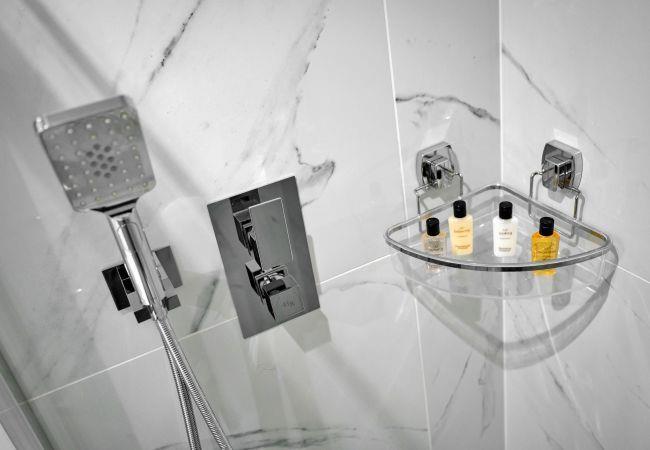 The apartment boasts a spacious, comfortable king size bedroom with flat screen TV, and separate bathroom with large shower, wash basin and WC.