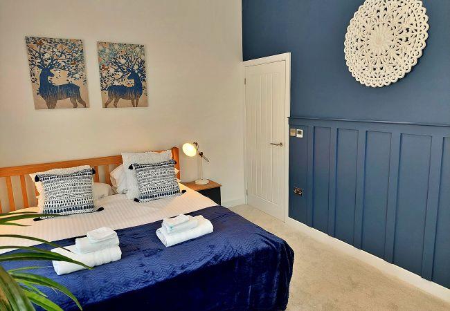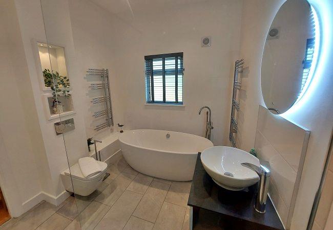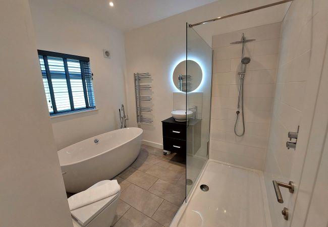 The master bedroom in Apple Lodge boasts a super king-size bed with ample storage space and an en-suite with a shower. The main bathroom offers a free-standing bath and shower. The fully equipped kitchen area includes an electric oven, electric hob, microwave, fridge freezer, washing machine, and dishwasher.