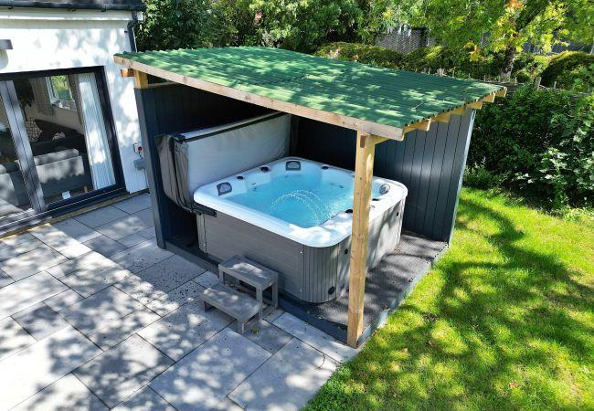 Through the patio doors, discover a private garden space with a barbecue and outdoor seating—a perfect spot to unwind after a long walk in the Devon countryside. The luxurious outdoor, undercover hot tub provides a relaxing retreat regardless of the weather, offering a homely spa experience.