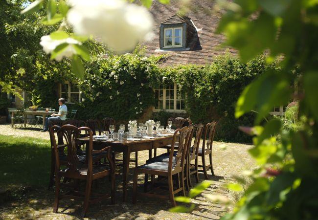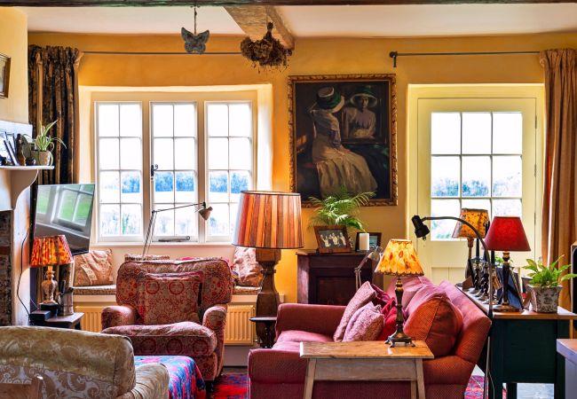 KITCHEN - a fabulous central room with a huge open inglenook fireplace and 5 large windows to the east and west, and a door to the gardens on each side of the house for ease of eating outside. Oil paintings and warm colours.