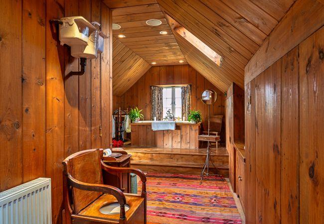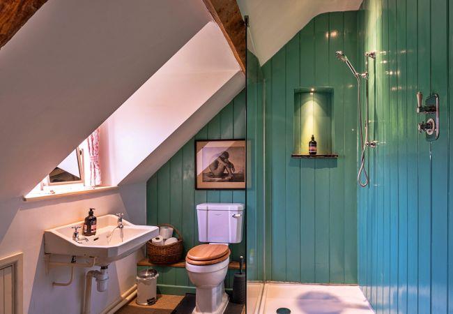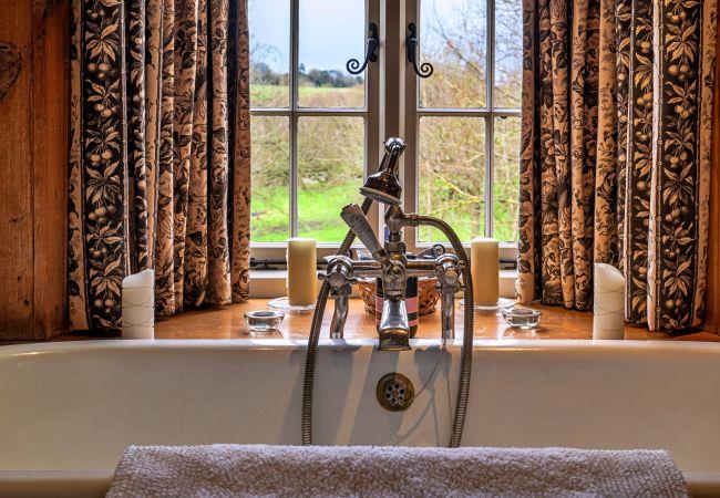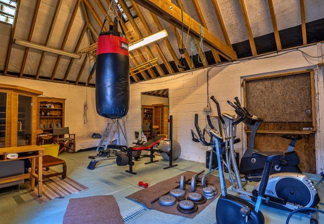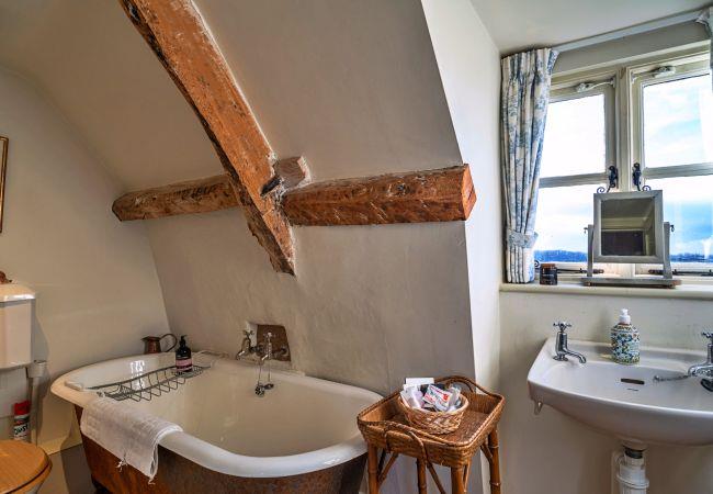 ENSUITE MASTER BATHROOM with walk in shower, double ended bath (with a stunning view from the window), and WC. This bathroom also boasts an exercise bike and rowing machine, some kettlebells, weights, fitballs and a yoga mat or two.