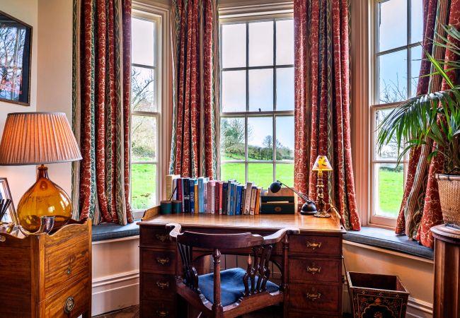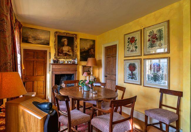 4) Study Area: a small, elegant table and chairs for early breakfast, cards, jigsaws, or homework next to a second small open fireplace.