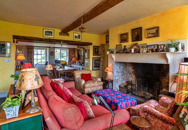 3) Kitchen Snug Area: with sofa and armchairs in front of the huge inglenook fireplace, with an Apple TV.