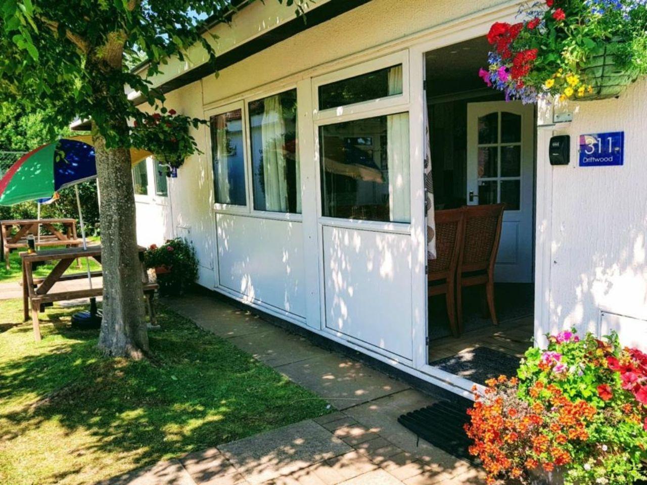 At the front of Driftwood Chalet is a small, private grassed area with wooden bench and seating. This leads on to a large, communal lawned area.