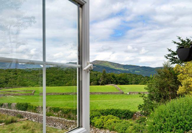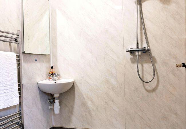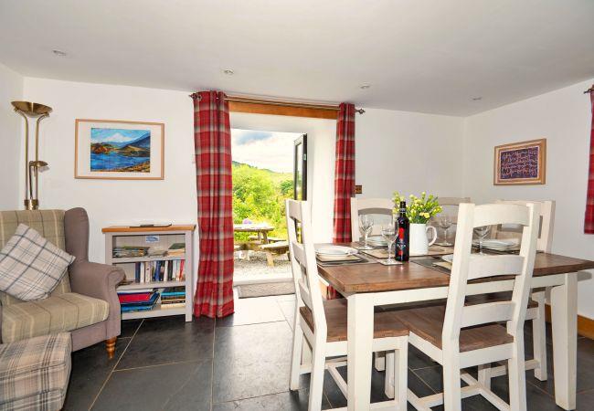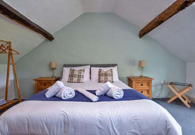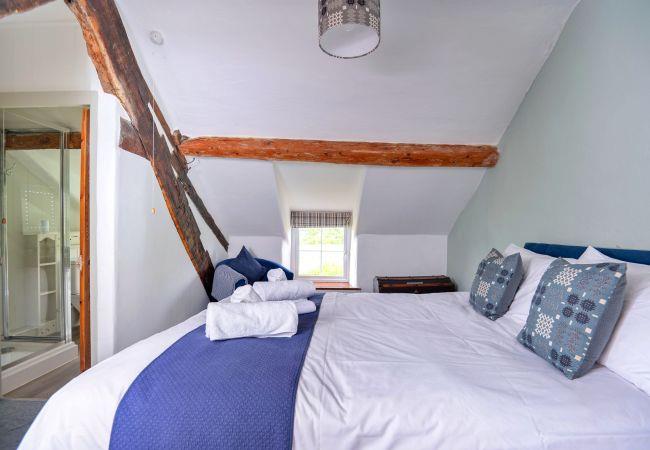 Upstairs, the cottage has two characterful bedrooms with exposed beams and sweeping views of the surrounding hills and mountains. The master bedroom includes a king-size bed and an en-suite bathroom, while the second bedroom can be arranged as a king or twin room. A second bathroom with a deep slipper bath and skylight completes the upstairs space, offering a relaxing spot to unwind.