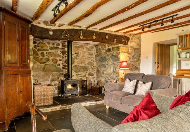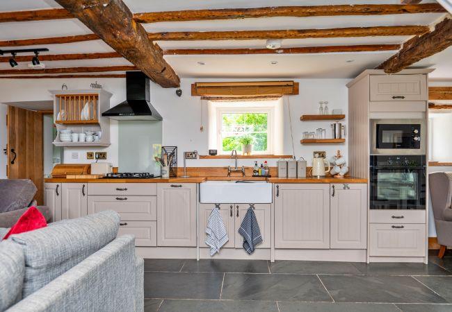Blending rustic charm with modern convenience, the cottage features underfloor heating throughout the ground floor, a large inglenook fireplace with a log-burning stove, and many original details, including exposed beams and rafters. The open-plan living space includes a cosy lounge, a fully equipped country-style kitchen with a double Belfast sink, and a spacious dining area that opens onto a large patio through French doors—ideal for enjoying the stunning surroundings. A separate utility room and a luxurious wet room with a rain shower add to the practicality and comfort of the home.