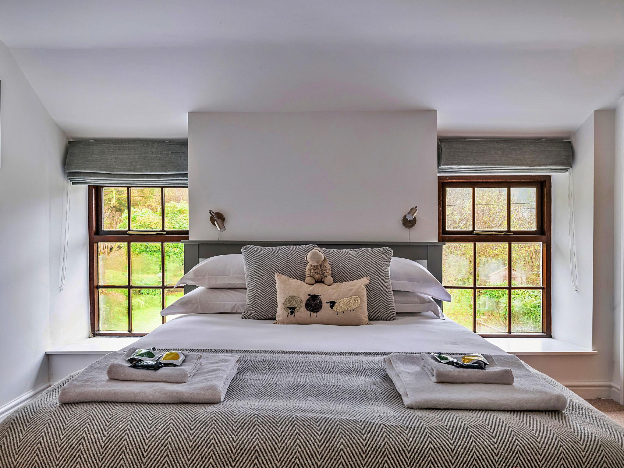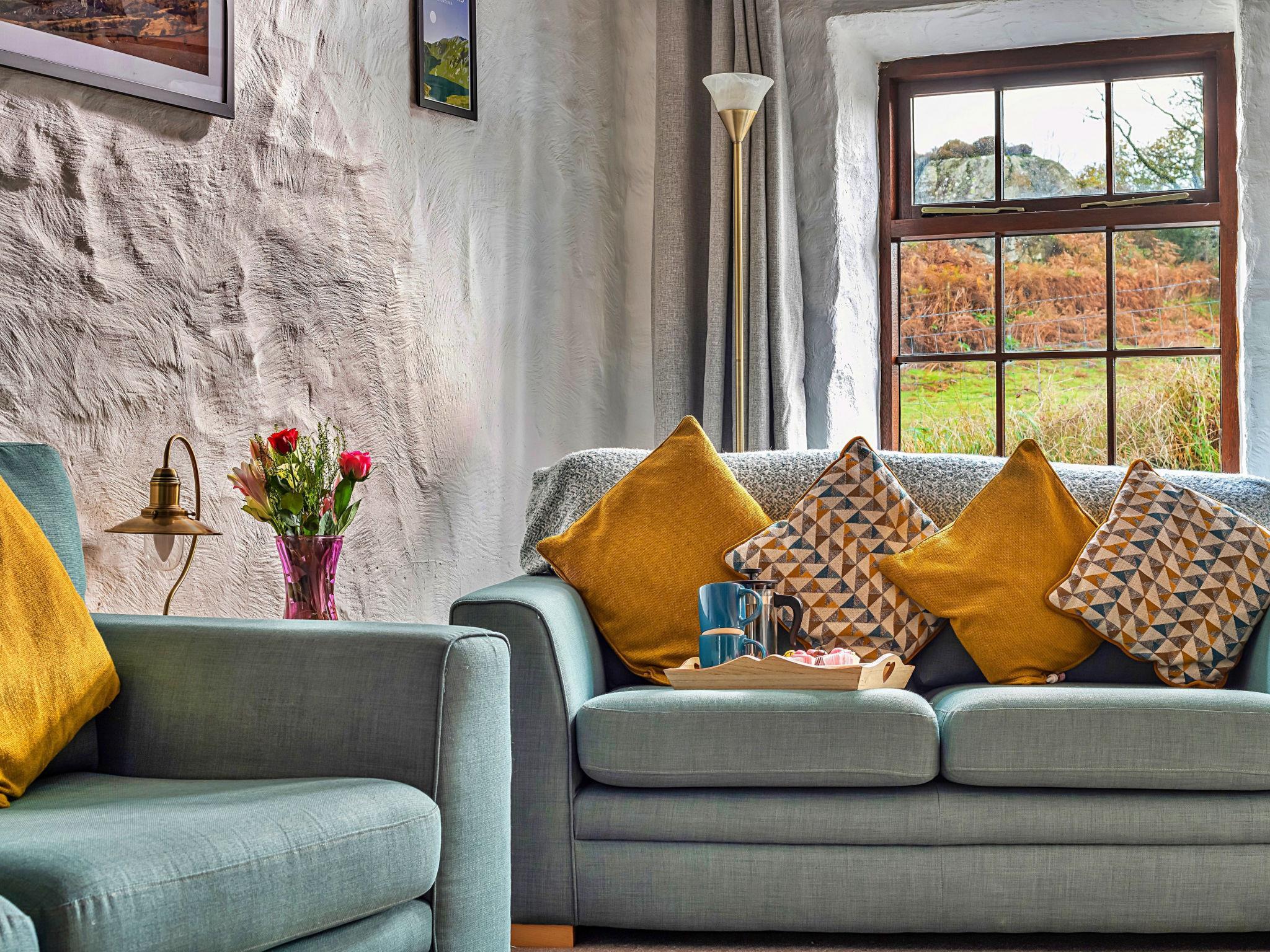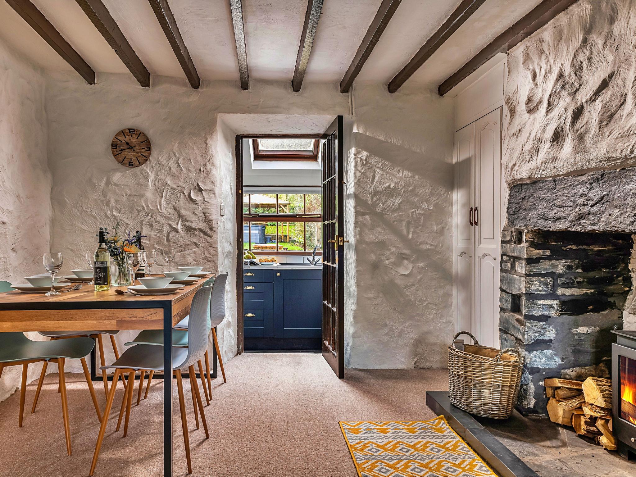 "Ty'r Delyn", 3-room house 110 m2. Object suitable for 5 adults. Living room with open-hearth fireplace and TV. 1 room with 1 bed and 1 french bed. 1 room with 1 double bed. Kitchen (4 hot plates, oven, dishwasher, toaster, kettle, microwave). Shower/WC. Terrace 30 m2. View of the mountains, the garden and the river. Facilities: iron. Internet (WiFi, free). Please note: non-smokers only. Smoke alarm.