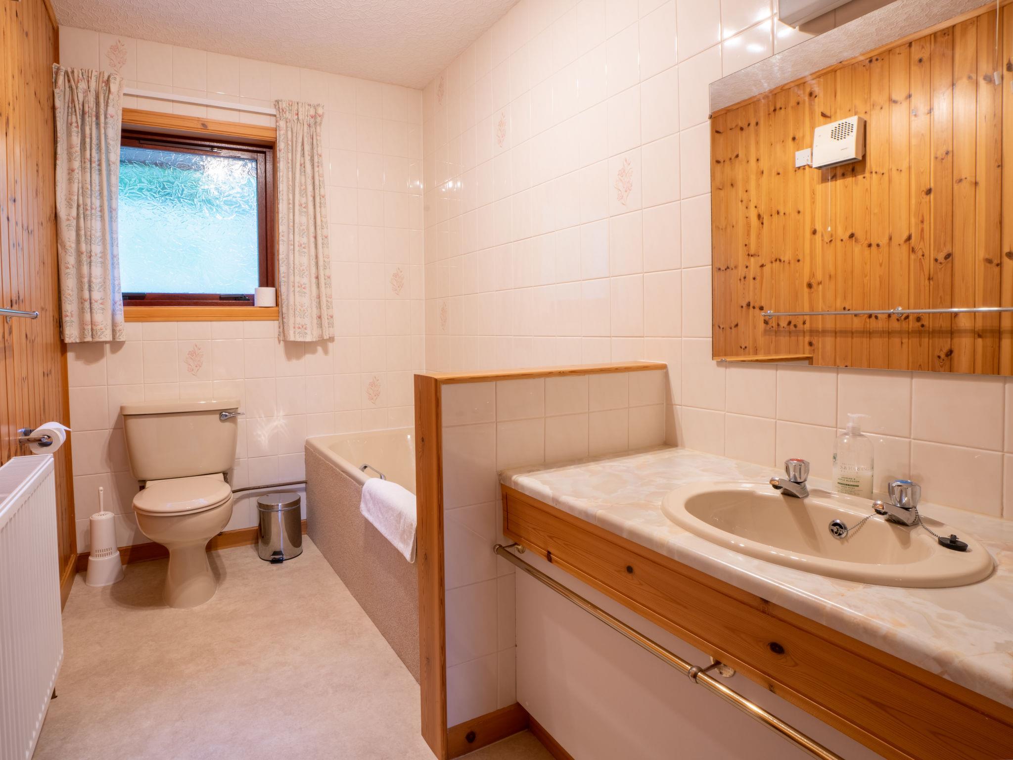 "Achmony Byre", 4-room bungalow. Tasteful and stylish furnishings: large living room with TV (flat screen). Exit to the patio. 2 rooms, each room with 1 double bed. 1 room with 2 beds. Open kitchen (4 hot plates, oven, dishwasher, toaster, kettle, freezer) with dining table. Bath/WC, shower/WC. Heating. Small patio. Marvellous panoramic view of the lake, the mountains and the countryside. Facilities: washing machine, dryer, children's high chair, baby cot for up to 2 year olds (extra), hair dryer. Internet (WiFi, free). Parking. Please note: suitable for families. Non-smoking house. TV only EN. Private entrance, smoke alarm. Strictly no workers or contractors. Location is only for holiday makers. HI-51440-F