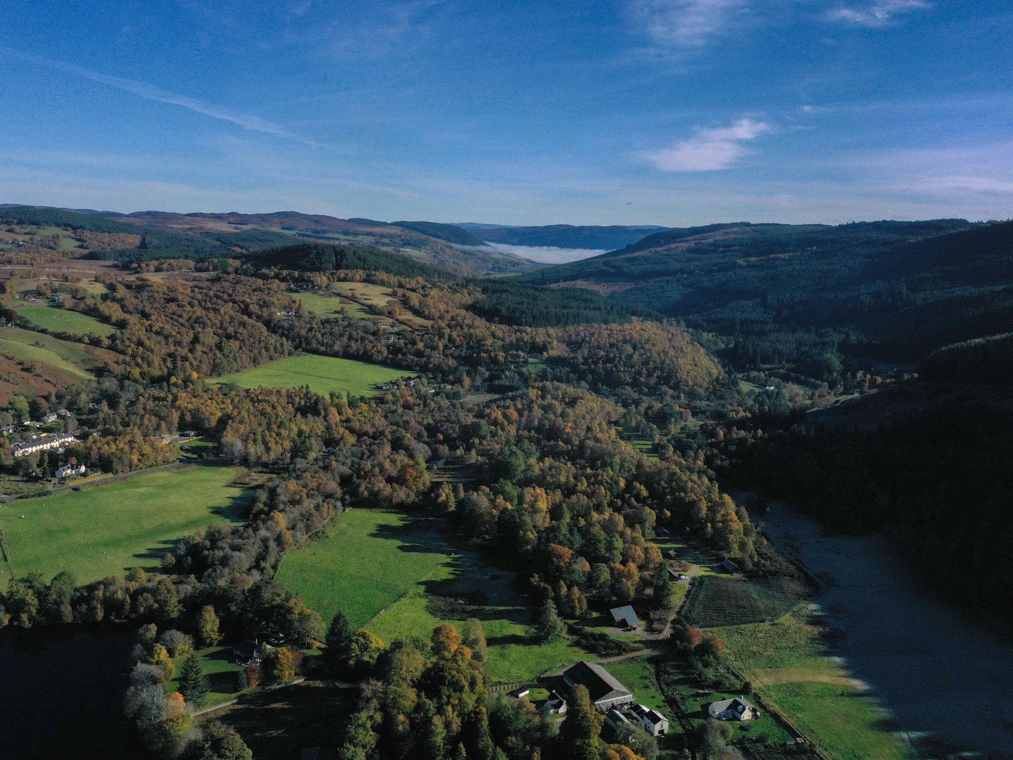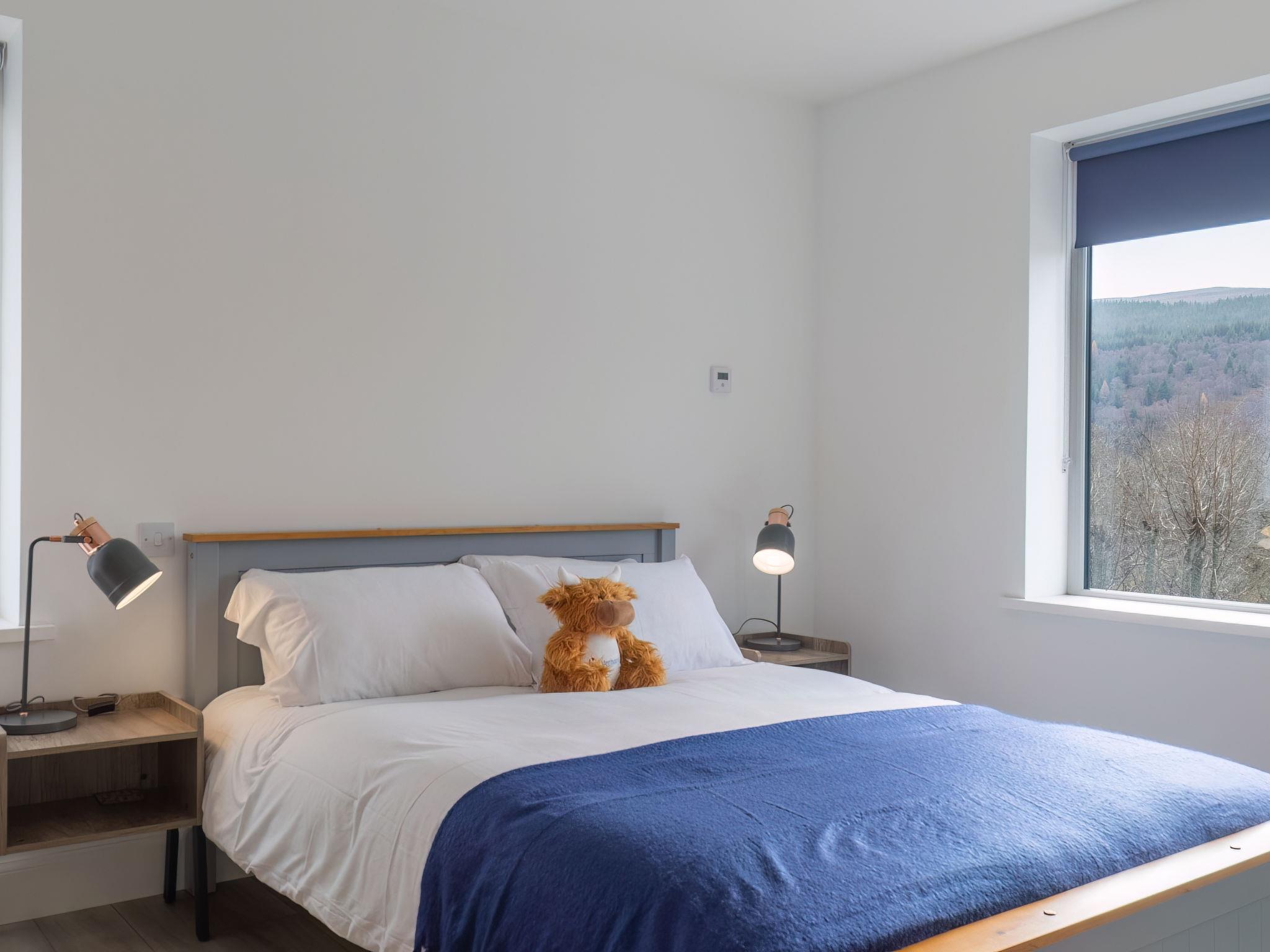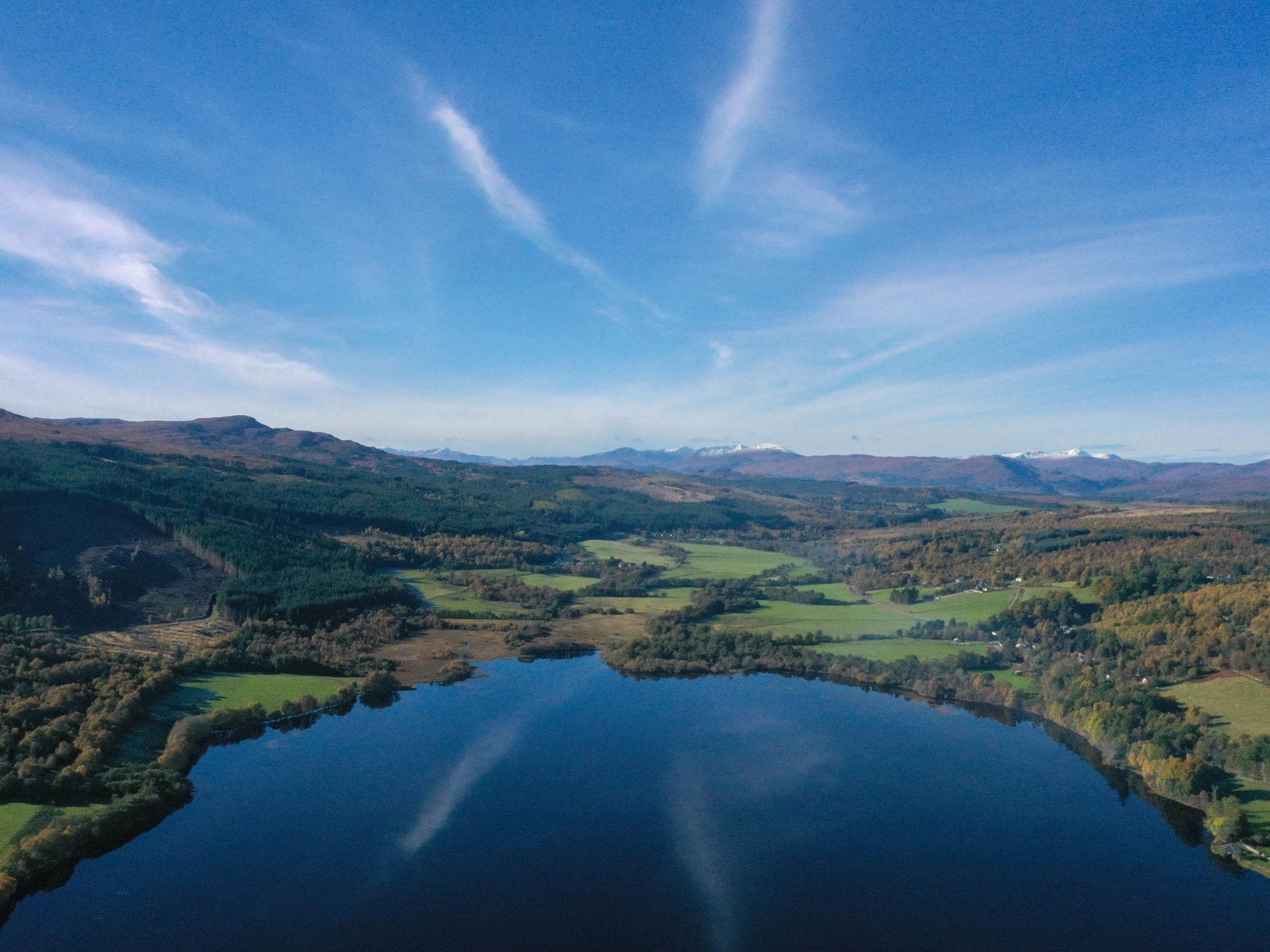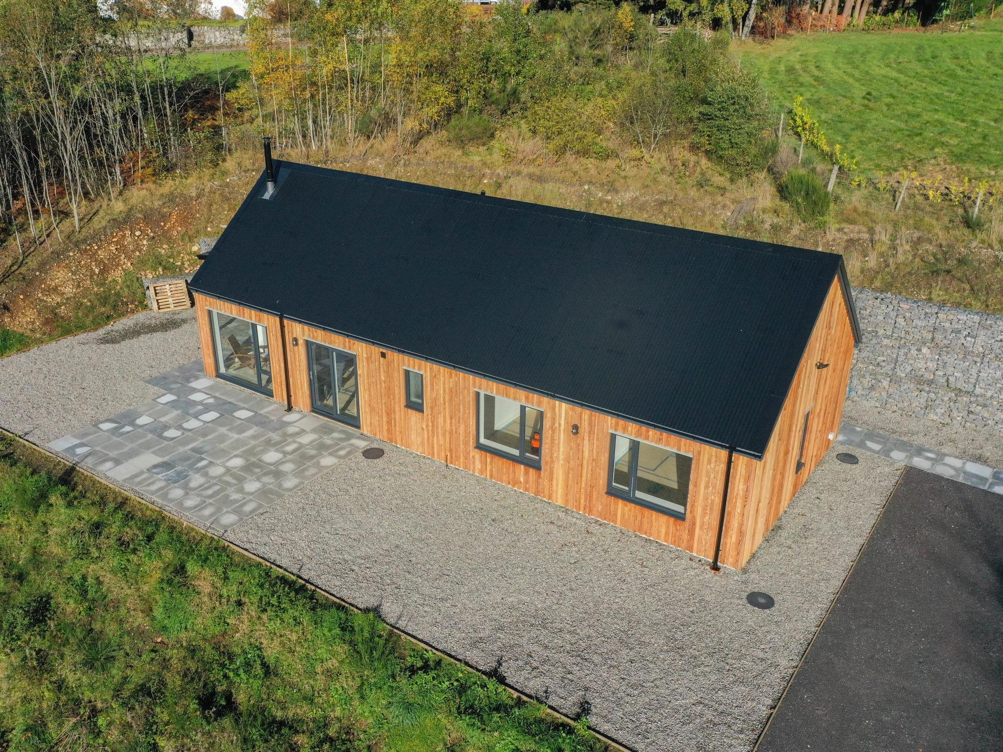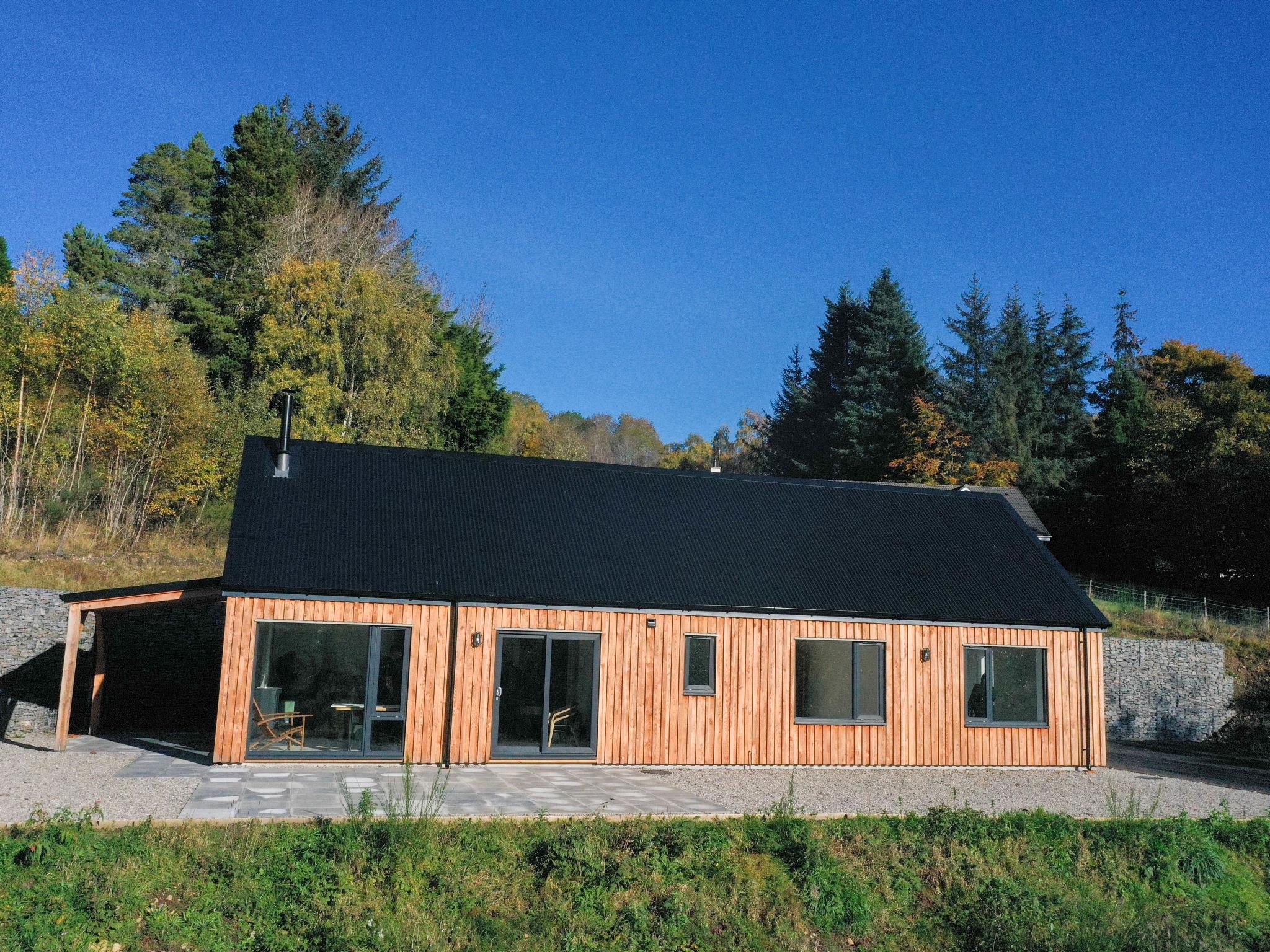 3-room chalet 92 m2. Spacious and bright, tasteful and stylish furnishings: open large living room with Scandinavian wood stove, dining table and TV (flat screen). Exit to the patio. 1 double bedroom with 1 double bed and shower/WC. 1 room with 2 beds. Open kitchen (4 hot plates, oven, dishwasher, microwave, freezer, grill). Shower/WC. Underfloor heating. Terrace furniture, barbecue. Marvellous panoramic view of the lake and the countryside. Facilities: washing machine, iron, children's high chair, baby cot for up to 2 year olds (extra), hair dryer. Internet (WiFi, free). Please note: suitable for families. Maximum 2 pets/ dogs allowed. TV only EN. Smoke alarm. The property sits in a beautiful peaceful location in nature overlooking Loch Meiklie. Telescope for stargazers.