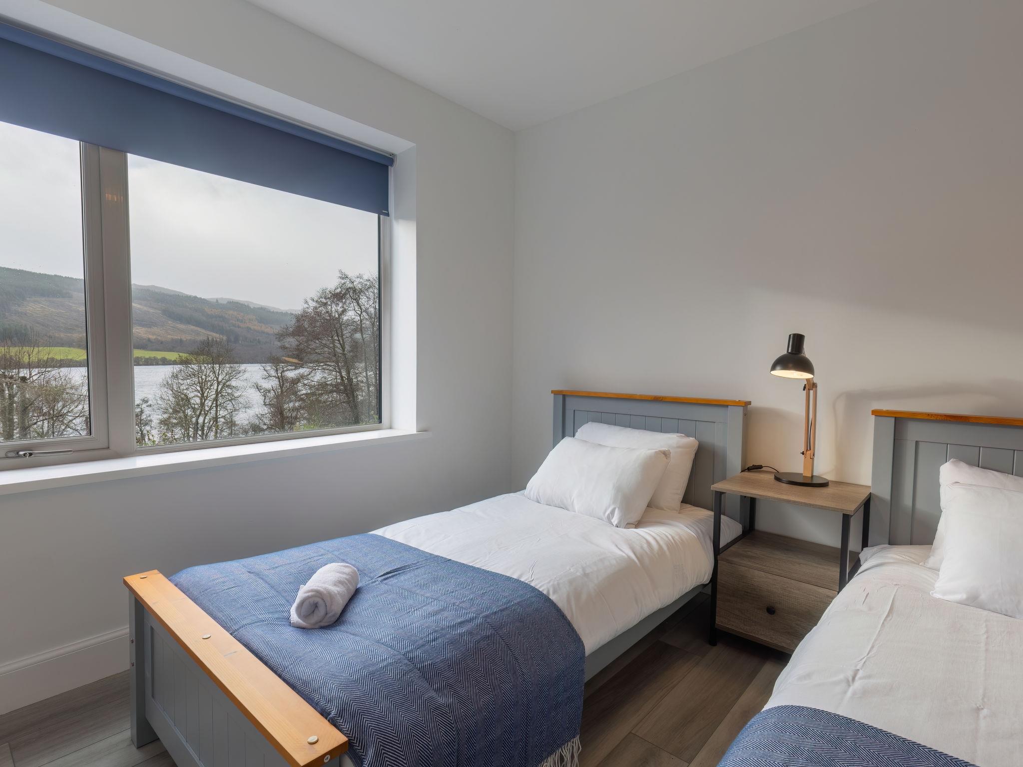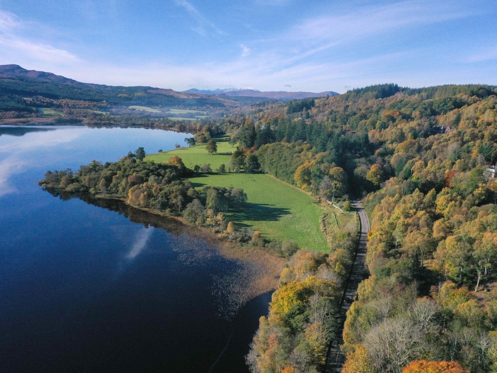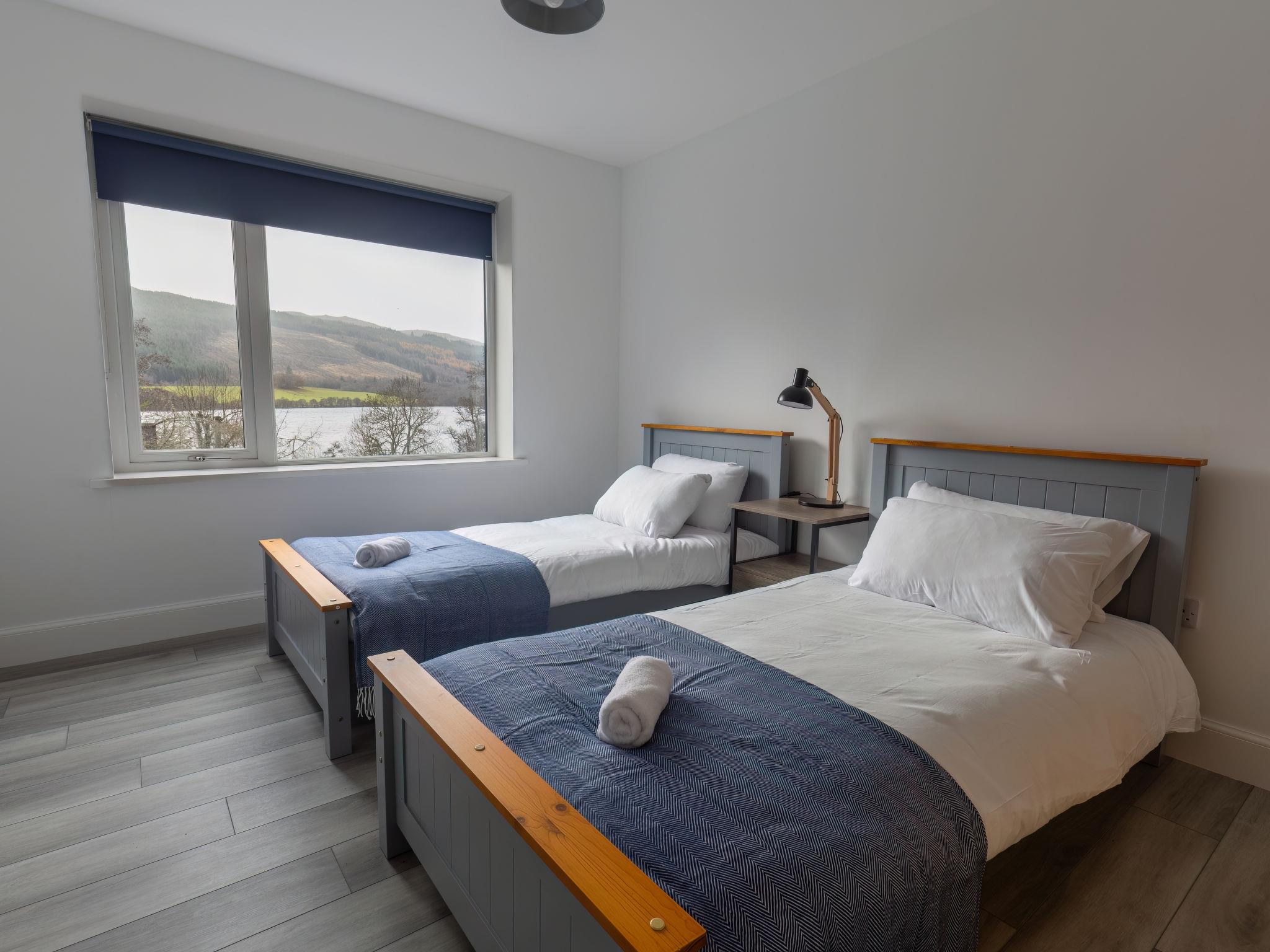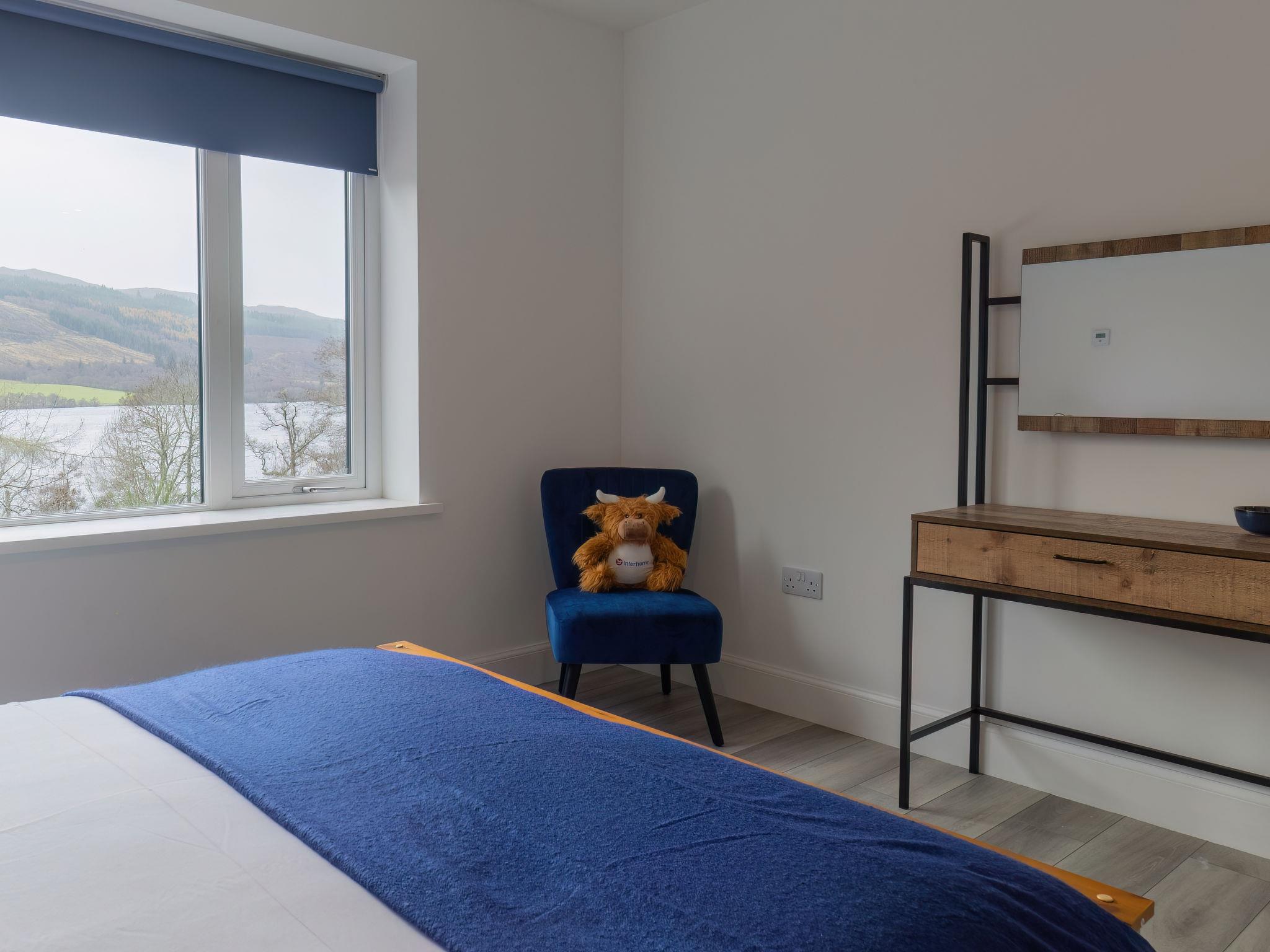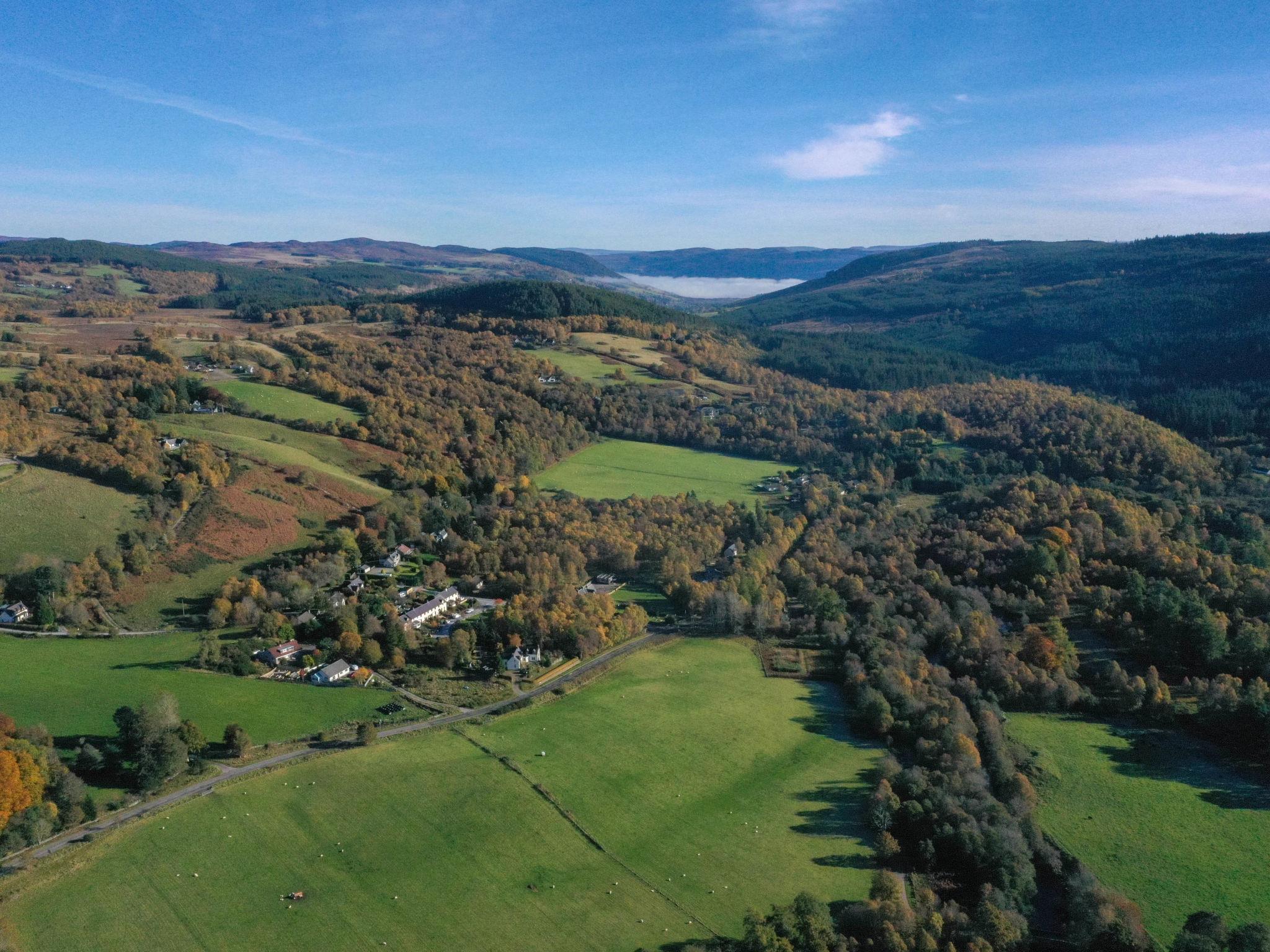 3-room chalet 92 m2. Spacious and bright, tasteful and stylish furnishings: open large living room with Scandinavian wood stove, dining table and TV (flat screen). Exit to the patio. 1 double bedroom with 1 double bed and shower/WC. 1 room with 2 beds. Open kitchen (4 hot plates, oven, dishwasher, microwave, freezer, grill). Shower/WC. Underfloor heating. Terrace furniture, barbecue. Marvellous panoramic view of the lake and the countryside. Facilities: washing machine, iron, children's high chair, baby cot for up to 2 year olds (extra), hair dryer. Internet (WiFi, free). Please note: suitable for families. Maximum 2 pets/ dogs allowed. TV only EN. Smoke alarm. The property sits in a beautiful peaceful location in nature overlooking Loch Meiklie. Telescope for stargazers.