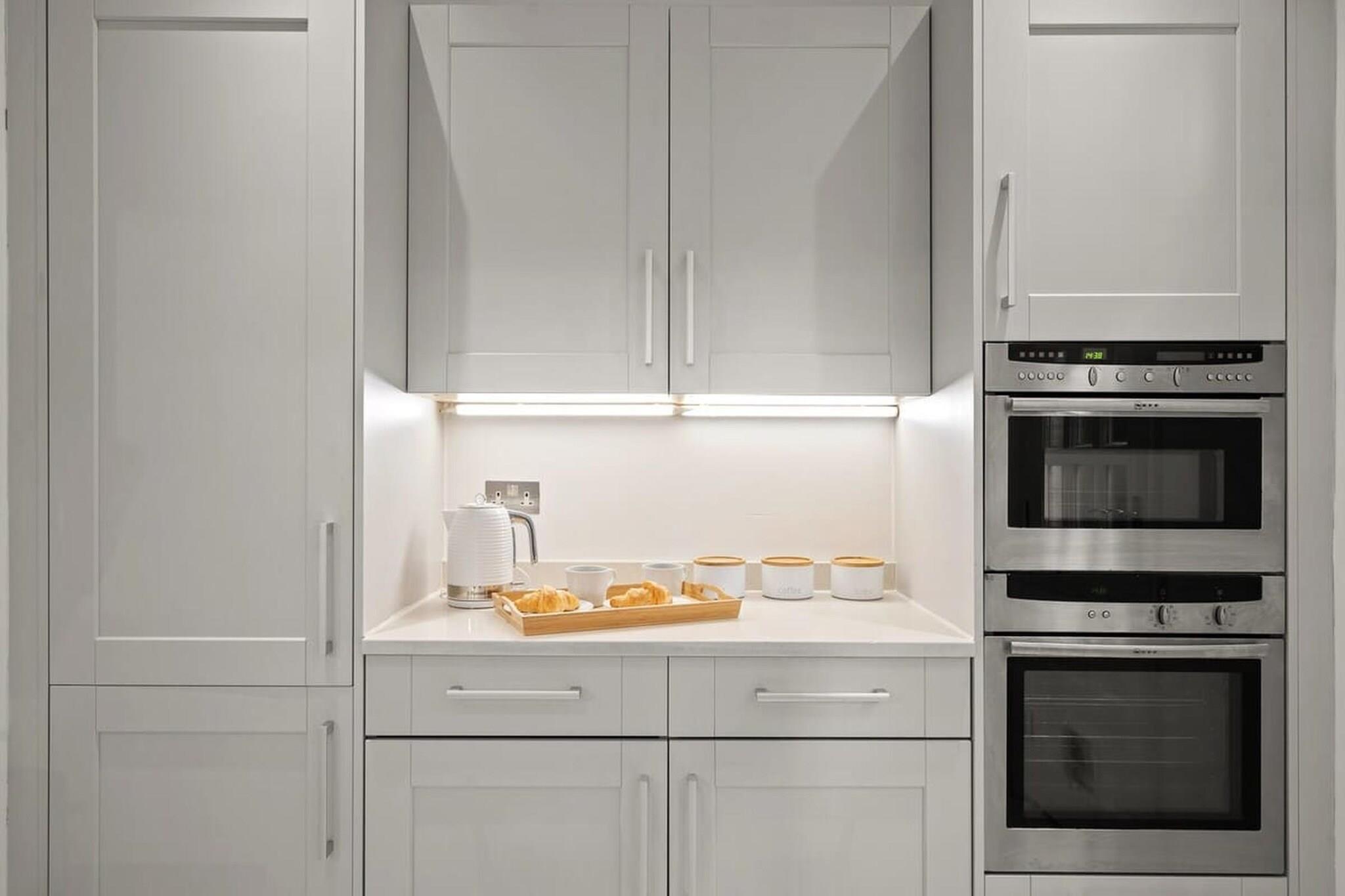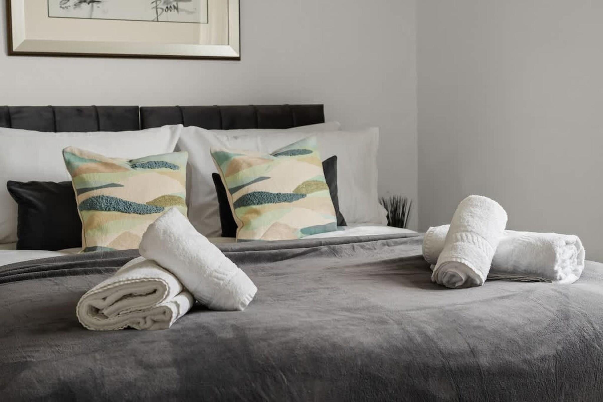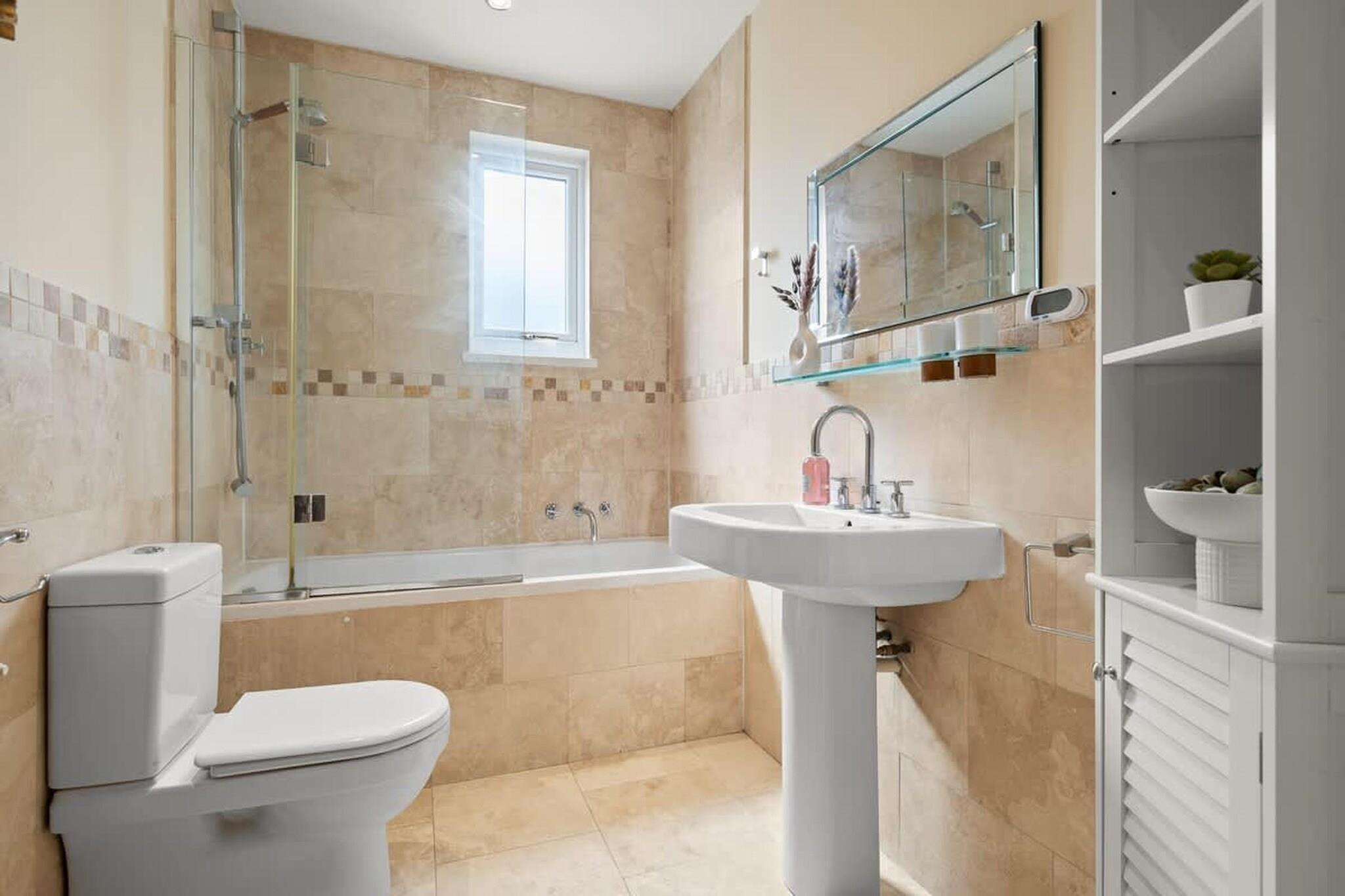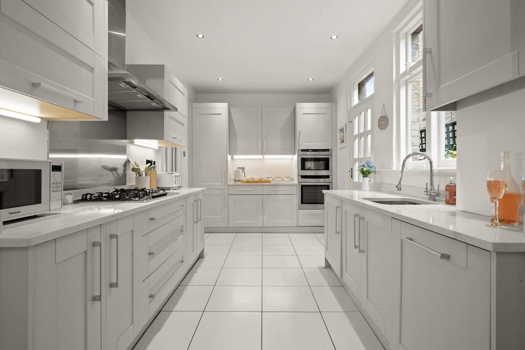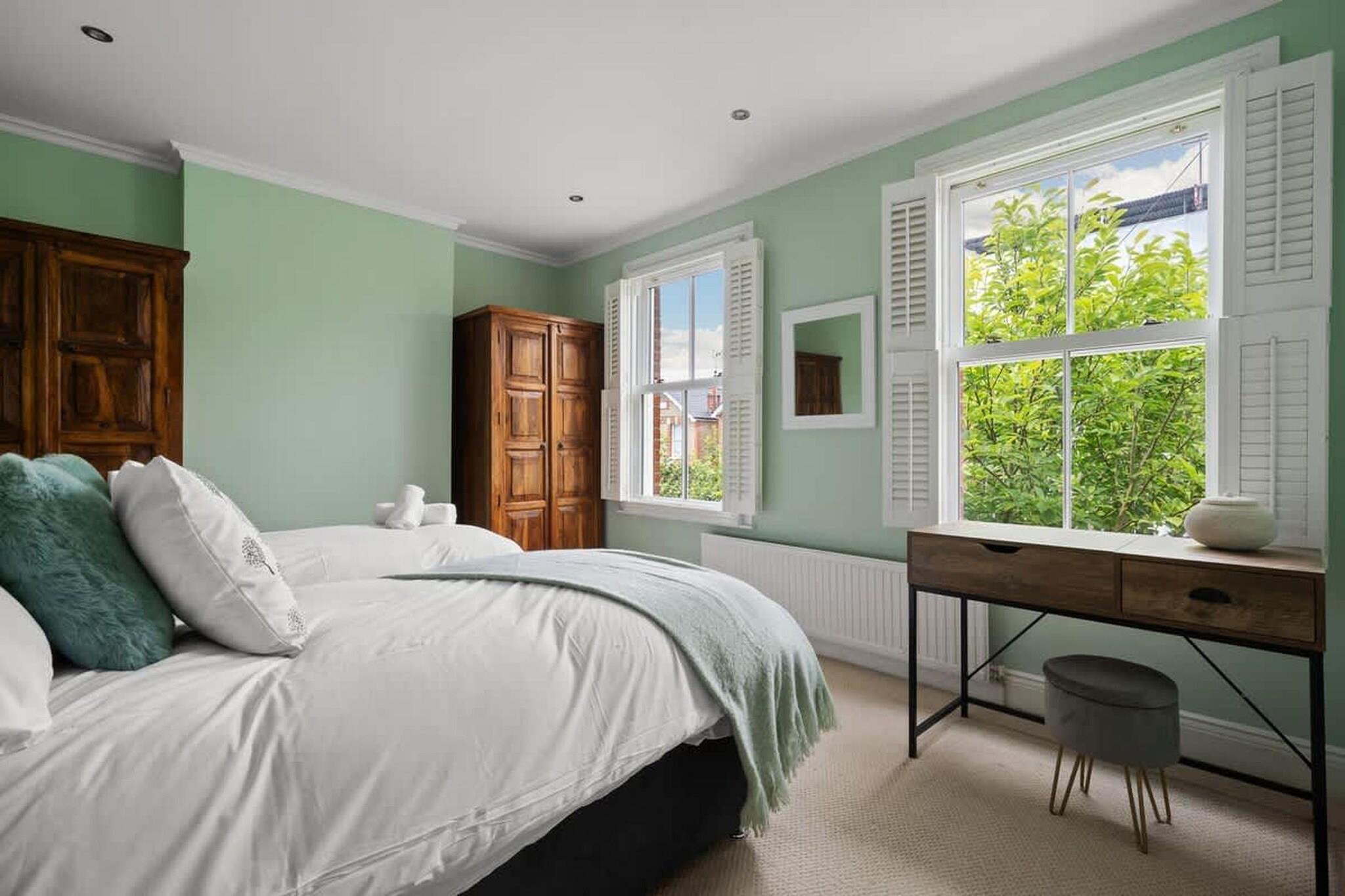 Dette velplanlagte familiehjem, beliggende i det grønne område ved floden Kingston upon Thames, tilbyder generøs plads, praktiske bekvemmeligheder og afslappede omgivelser i nærheden af det centrale London. Det er ideelt til familier, venner eller arbejdspladser, hvor komfort og bekvemmelighed er lige så vigtige som beliggenhed. I stueetagen er der et hyggeligt opholdsområde med tv til afslappede aftener i stuen. Det åbne køkken er fuldt udstyret med ovn, opvaskemaskine, køleskab med fryser og spisebord, hvilket gør det nemt og hyggeligt at spise sammen. Et separat toilet på denne etage tilføjer daglig bekvemmelighed. Ovenpå er huset indrettet til fleksibel soveplads. Det ene soveværelse har to enkeltsenge og et tv, ideelt til børn eller venner, der deler sengen. Det andet soveværelse har en kingsize-dobbeltseng og et tv for ekstra komfort. Master-suiten har en kingsize-seng, tv og et privat badeværelse med badekar, hvilket skaber et roligt tilflugtssted i huset. Et separat moderne fælles badeværelse sikrer, at alle har plads og privatliv. Yderligere faciliteter såsom vaskemaskine/tørretumbler, varme, højstol, dedikeret arbejdsplads, Wi-Fi og offentlig parkering gør ejendommen særligt velegnet til længere ophold. Herfra kan du nyde gåture langs Themsen, udforske den historiske grund ved Hampton Court Palace eller tilbringe en dag med at se hjorte og cykle gennem Bushy Park. Kingstons livlige bymidte, markeder, caféer og butikker ligger alle i nærheden, mens hurtige transportforbindelser gør det centrale London let tilgængeligt.