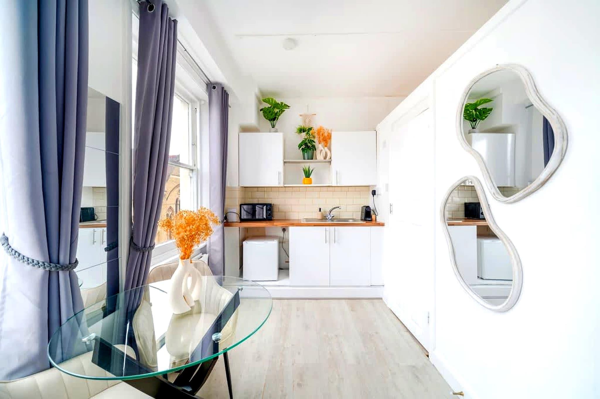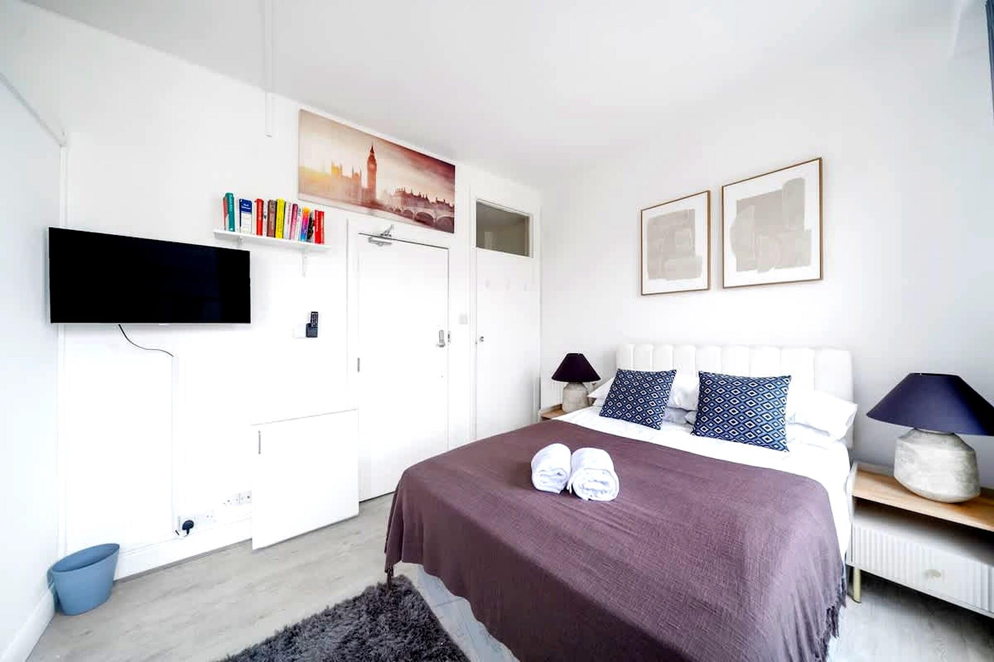 Denne moderne lejlighed er perfekt til et ophold i London med gode forbindelser og tilbyder en kompakt og effektiv planløsning, kun en kort gåtur fra West Kensington Underground Station. Ideel til solorejsende eller par, da den giver hurtig adgang til det centrale London, samtidig med at den er omgivet af de livlige kvarterer Kensington, Fulham og Chelsea. Indvendigt er rummet omhyggeligt arrangeret for at kombinere opholds-, spise- og soveområder i ét sammenhængende layout. En komfortabel dobbeltseng står ved siden af et spisebord og tv, hvilket skaber et praktisk miljø til både afslapning og hverdagsbrug. Tekøkkenet er udstyret med kaffemaskine, køleskab med fryser, mikrobølgeovn og opvaskemaskine, hvilket giver mulighed for bekvem selvforplejning på trods af den kompakte opsætning. Det private badeværelse har bruser, toilet og hårtørrer, mens Wi-Fi, varme og essentielle faciliteter sikrer et problemfrit og behageligt ophold. Lejligheden er designet med fokus på enkelhed og brugervenlighed, hvilket gør den til et passende valg til kortere ophold eller storbyferier. Dens effektive planløsning giver gæsterne mulighed for at få mest muligt ud af den tilgængelige plads uden at gå på kompromis med vigtige bekvemmeligheder. Lejligheden ligger inden for 3 minutters gang fra West Kensington Station og tilbyder fremragende transportforbindelser i hele London. Nærliggende områder som Kensington, Fulham og Chelsea byder på et bredt udvalg af caféer, restauranter og butikker. Med sit praktiske design og stærke beliggenhed er denne lejlighed ideel til et bekvemt og godt forbundet ophold i byen.
