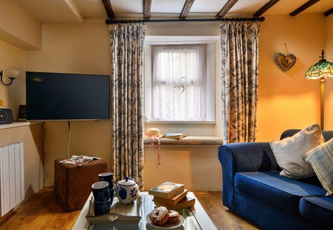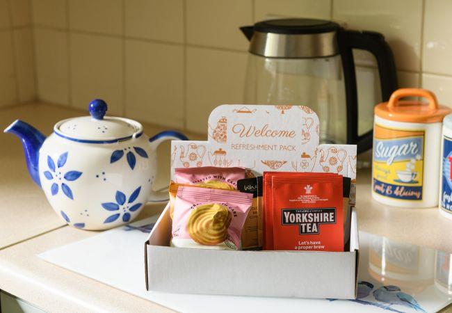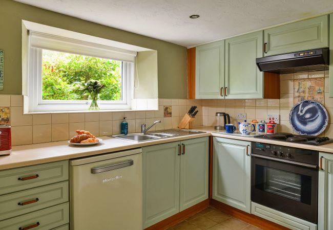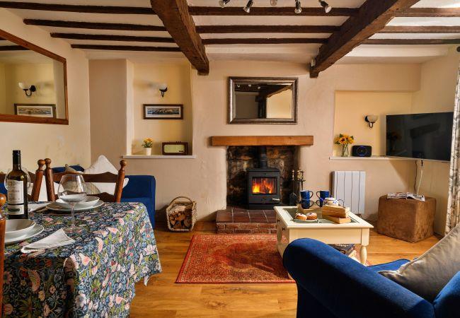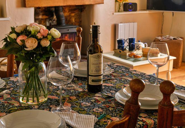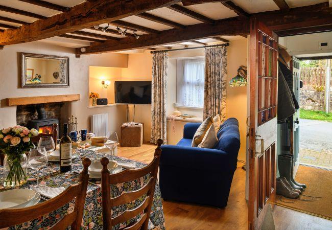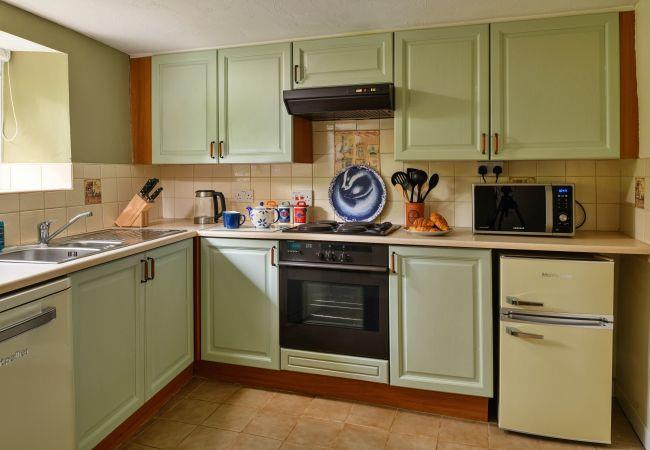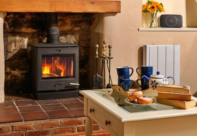Walking in through the handy porch area, the wooden beams against the white ceiling leads to the cottage feel, guests are greeted by the inviting living room sharing a small dining area. The fireplace and functional log burner makes for a cosy evening whilst relaxing on either of the sofas, further entertainment can be found on the smart TV, whilst WiFi is also provided.