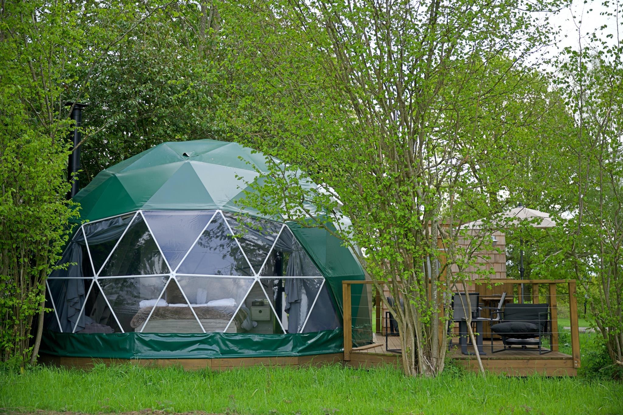 Dette luksuriøse glamping-tilflugtssted er en fredfyldt, kæledyrsvenlig kuppel i chalet-stil, og tilbyder en fredelig flugt ud i naturen, perfekt for par eller små familier. Indkvarteringen kan sove op til fem gæster med to kingsize-senge og en ekstra seng og har et rummeligt interiør i åbent plan med spiseplads, en sækkestol og et privat forhøjet dæk komplet med omgivende aftenbelysning og naturskøn udsigt over landskabet. Kæledyr er velkomne, med de omkringliggende græsarealer og skove giver en naturlig legeplads for firbenede ledsagere - selvom kæledyr ikke må efterlades uden opsyn. Beliggende privat i de kentiske skove, tilbyder kuplen en fordybende udsigt over "The Garden of England", med udsigt over åbne marker fra dens solbeskinnede dæk. Beliggende kun 8 minutter fra Chiddingstone Castle, Hever Castle og Penshurst Place, er ejendommen godt placeret for besøg i den lokale kulturarv. Yderligere attraktioner som Royal Tunbridge Wells, Groombridge Place og Sissinghurst Castle er også i nærheden. Med London under en time væk i bil eller tog, og Gatwick Lufthavn kun 35 minutter væk, er det både fjerntliggende og let tilgængeligt. Kuppelen er designet til komfort året rundt og inkluderer et kompakt tekøkken til selvforplejning, et privat badeværelsesanlæg lige ved siden af ??og en hyggelig indendørs brændeovn til køligere aftener. Ekstra bekvemmeligheder inkluderer en Wi-Fi-hub, mediekonsol til trådløs opladning, spiseplads og omklædningsrum med opbevaring. Sengelinned, håndklæder og parkering er alt inkluderet, hvilket sikrer en veludstyret boutique-glamping-oplevelse midt i naturlig ro.