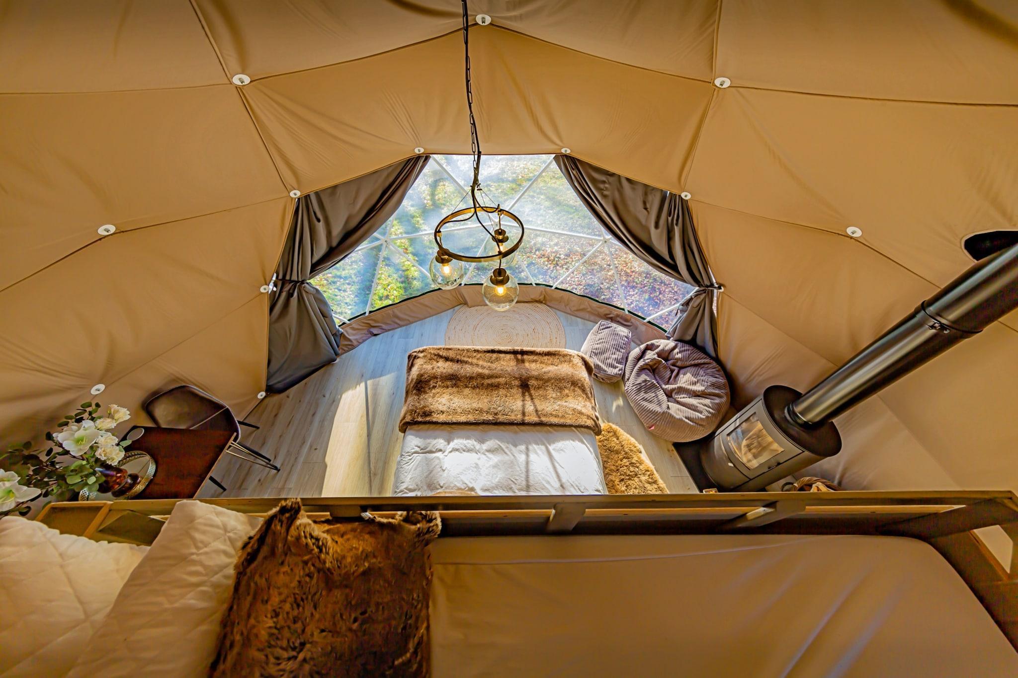En fantastisk kuppel i chalet-stil på en bjergskråning, dette luksuriøse glamping-retræte kun for voksne er ideelt for par eller små grupper, der søger komfort og afsondrethed i naturlige omgivelser. Med plads til op til fem gæster fordelt på to kingsize-senge og en ekstra seng, kan kuplen prale af et rummeligt interiør med afslappet indretning, en sækkestol og et privat forhøjet dæk. En separat overdækket terrasse huser et privat brændefyret spabad med luft- og vandstråler - perfekt til at nyde udsigten over Kents landskab. Bemærk venligst, at denne ejendom ikke er kæledyrsvenlig. Beliggende på et eksklusivt glamping-sted i Hoath, har kuplen udsigt over åbne græsarealer og skove og tilbyder panoramaudsigt over "The Garden of England". Dens fredelige, forhøjede position giver det perfekte udsigtspunkt for naturkiggeri og stjernekiggeri. Inden for blot 8 minutter kan gæsterne nå berømte attraktioner, herunder Chiddingstone Castle, Hever Castle og Penshurst Place. Andre destinationer såsom Royal Tunbridge Wells og Sissinghurst Castle er i nærheden, mens London og Gatwick Lufthavn er begge under en time væk. Indvendigt er kuplen udstyret til helårsophold med tekøkken, påklædningsområde og et stilfuldt spiseområde. En brændeovn sikrer varme og stemning i de køligere måneder, mens Wi-Fi-hubben og mediekonsollen med trådløs opladning tilbyder moderne komfort. Private badeværelser er bekvemt placeret kun få skridt væk. Alle væsentlige ting, herunder håndklæder, sengetøj, varme og parkering, er tilvejebragt for en komfortabel boutique-glamping-oplevelse i hjertet af det landlige Kent.