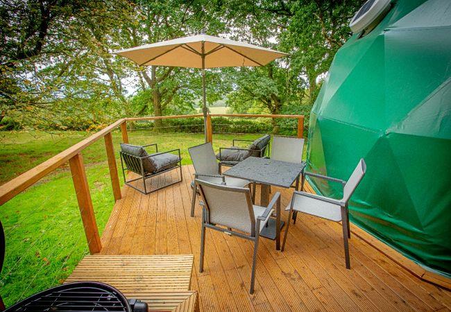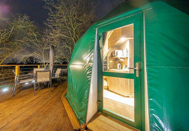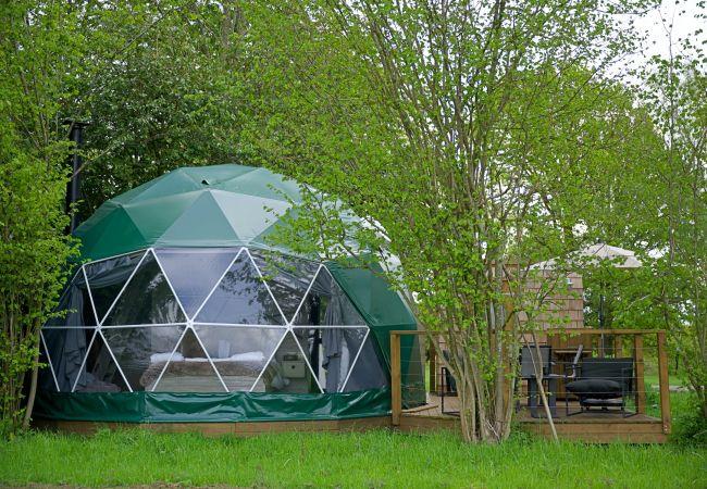 Hever is located very privately as it is tucked into woodlands which surround the dome on most sides. The decking