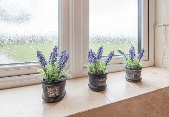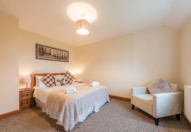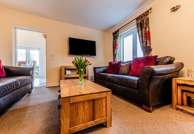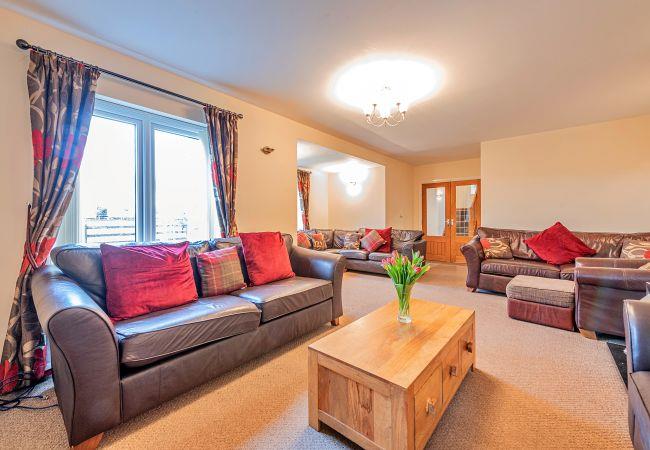 The spacious lounge invites guests to unwind with plush 2/3-seater sofas and cosy reading chairs, all arranged around a large TV. Outside, the property boasts a large, enclosed garden with a patio and seating for up to 14 guests, creating a peaceful backdrop for your stay.