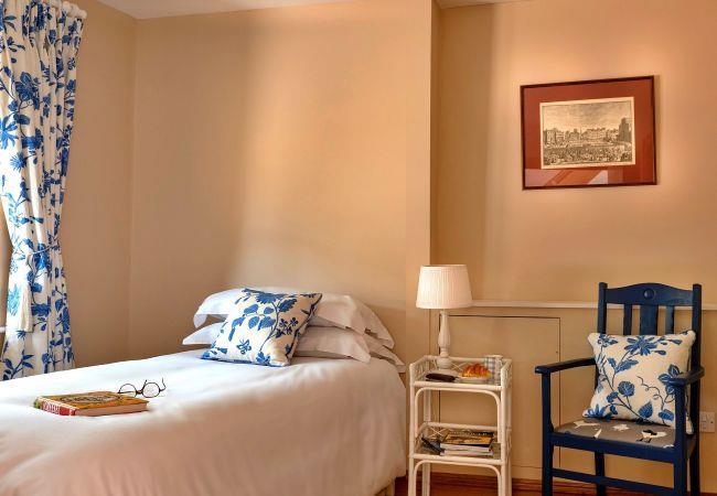 Upstairs, the master bedroom is a true retreat, featuring a super-king-size brass bed, and comfortable chairs. The spacious en-suite bathroom includes a luxurious bath, walk-in shower, vanity unit, and WC. The second upstairs bedroom offers a pair of elegant brass twin beds that can be zip-linked into a super-king upon request. This room also includes comfortable chairs and a dressing table, as well as its own beautiful en-suite with a bath, walk-in shower, vanity unit, and WC.