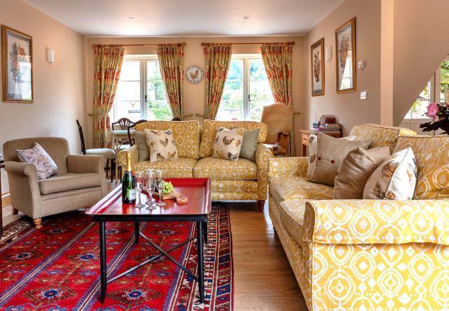 The open-plan living area is both spacious and inviting, with comfortable sofas and chairs arranged around an open fire, creating a cozy space for relaxation. The dining area features an extendable table that can seat up to 16 people—perfect for larger gatherings or special occasions. Berry Pen Cottage is equipped with modern conveniences to ensure a comfortable stay, including underfloor heating throughout, double-glazed windows, and a pressurized water system for excellent shower pressure.
