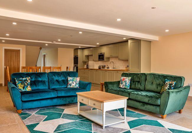 Barn Six, sleeping up to eight guests, offers a spacious open-plan living space with a smart TV and bi-fold doors leading to the private garden. The dining area is perfect for shared meals, while the fully equipped kitchen includes an electric oven, electric hob, microwave, fridge, freezer, dishwasher, and a welcome pack for your convenience. A utility room with a washing machine and tumble dryer makes for an easy self-catered stay.