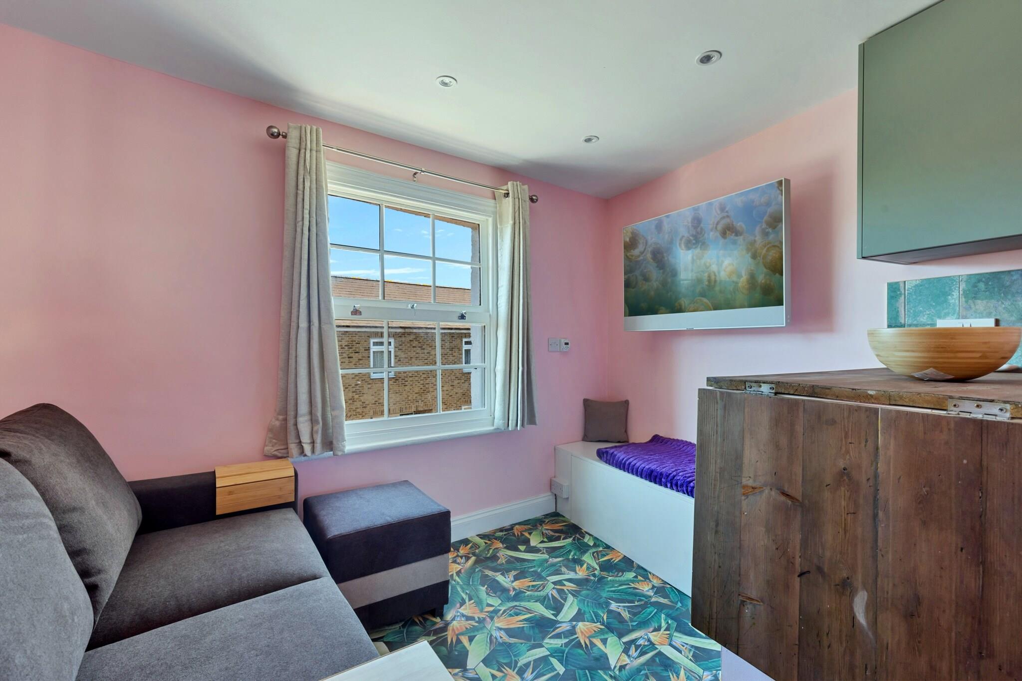 Oplev en fortryllende urban oase i det pulserende hjerte af Greenwich, South East London, hvor chik stil møder tankevækkende design i en charmerende studielejlighed. Dette klogt sammensatte tilflugtssted er det ideelle tilflugtssted for par eller små familier, der søger komfort og praktiske muligheder uden at ofre karakter. Når du træder ind, vil du finde en hyggelig lounge, der lokker med en lun dobbelt sovesofa, perfekt til at slappe af efter en dag med udforskning. Sæt dig til rette til en filmaften med SKY TV, eller nyd rummets unikke charme, forstærket af dets smarte layout. Forhøjet over opholdsområdet tilbyder to dejlige loftsenge en finurlig krog for ældre børn og teenagere, der inviterer dem til at klatre op ad stigen og gøre krav på deres eget hyggelige gemmested. Selvom denne charmerende krog måske ikke er egnet til små børn eller dem med mobilitetsudfordringer, tilføjer den et sjovt element til dit ophold. Ud over opholdsrummet vil du opdage et overraskende veludstyret køkken, komplet med alt det nødvendige til selvforplejning, fra en vaskemaskine til en cafetière til din morgenkaffe. Det moderne badeværelse har en forfriskende bruser, og et lille opbevaringsområde i stueetagen sikrer, at dine ejendele forbliver organiseret under dit besøg. En kort otte-minutters gåtur bringer dig til Greenwich metrostation, der åbner ubesværede transportforbindelser til det centrale London og videre. Dette stilfulde studie er omgivet af ikoniske attraktioner såsom Royal Observatory og National Maritime Museum og giver den perfekte baggrund for både forretningsrejser og afslappede flugter. Skab uforglemmelige minder i et af Londons mest maleriske kvarterer, hvor komfort møder bekvemmelighed for et virkelig mindeværdigt ophold.