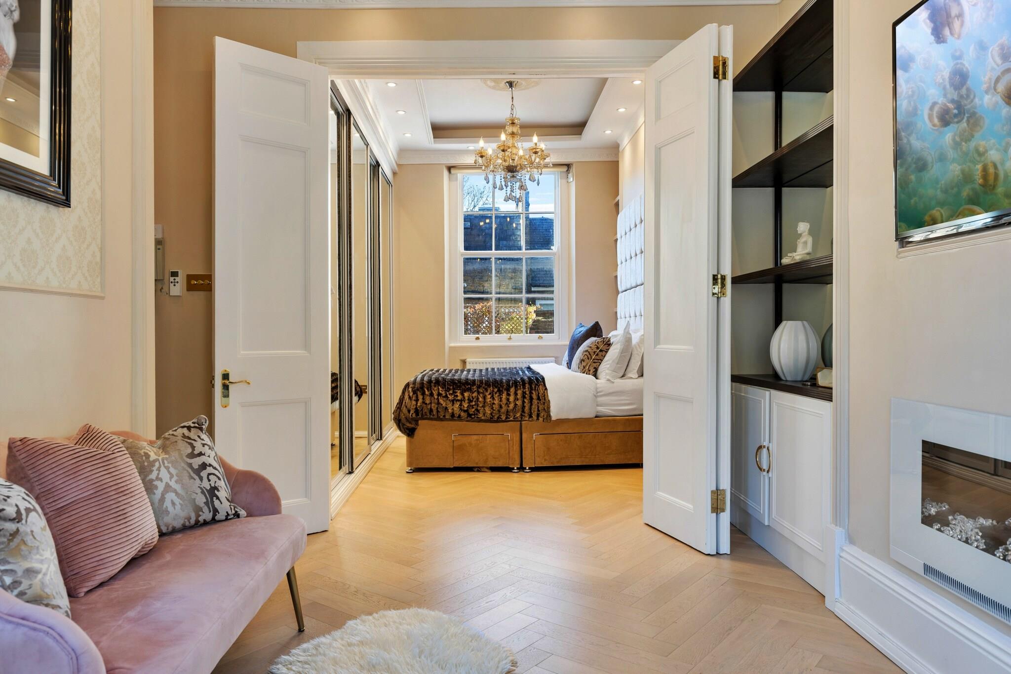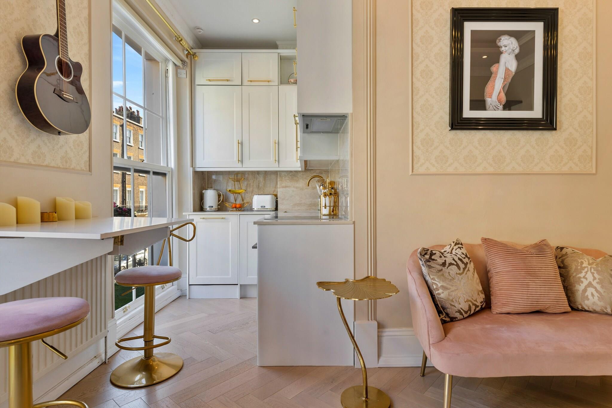 Beliggende i hjertet af London tilbyder denne elegante boutiquelejlighed et luksuriøst tilflugtssted i det charmerende og historiske Marylebone-kvarter. Beliggende på en fredelig gade i en georgiansk bygning, giver det en perfekt ramme for en romantisk ferie eller en stilfuld storbyferie for to. Nyd en fantastisk udsigt fra balkonen, mens du slapper af med et glas vin, mens du ser solnedgangen over Londons skyline. Interiøret byder på klassisk, sofistikeret indretning med højt til loftet, lysekroner og en farvepalet af mørke lyserøde og messingaccenter. Det rummelige opholdsområde omfatter et smart-tv, højhastigheds-Wi-Fi og et dedikeret arbejdsområde. Det fuldt udstyrede køkken har Siemens-apparater, herunder køleskab, fryser, opvaskemaskine, mikroovn, ovn og kogeplader, med den ekstra bekvemmelighed fra en vaskemaskine/tørretumbler. Soveværelset har en king-size seng, fire dobbelte garderobeskabe og et toiletbord, mens det luksuriøse badeværelse byder på et spabad med jacuzzi, bruser og marmorfinish. Marylebone er kendt for sin rolige charme med en blanding af skæve museer, uafhængige butikker, traditionelle pubber og smarte butikker. Udendørs ligger Regent's Park kun en kort gåtur væk, hvilket giver rigelig plads til afslapning. Parkeringsmulighederne omfatter parkering på gaden på Balcombe Street og nærliggende NCP-parkeringspladser. Bemærk venligst, at lejligheden ligger på første sal og er tilgængelig via en enkelt trappe, og velopdragne hunde er velkomne til at deltage i dit ophold.