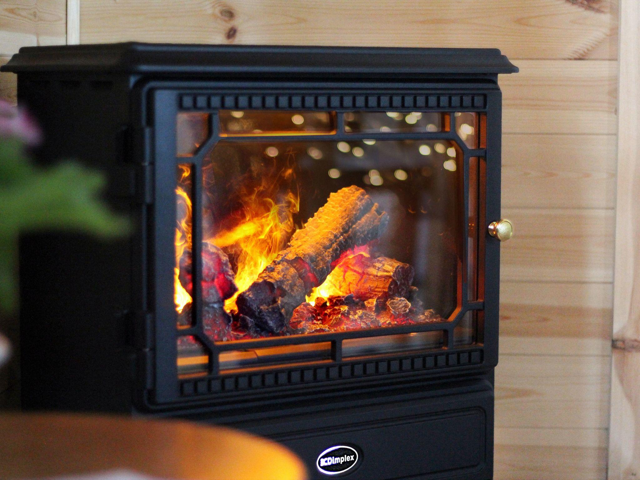 Open Plan Living Area: Positioned in front of the kitchen area, there is a solid oak dining table to seat four, a Scandi styled clic-clac sofa-bed, a LED television with integrated Bluetooth speaker for music playback, and a modern Dimplex Opti-myst electric faux woodburner stove with lifelike smoke & flame effect. The whole space is centrally heated with a modern Smart enabled wall panel heater placed in the open plan hallway.