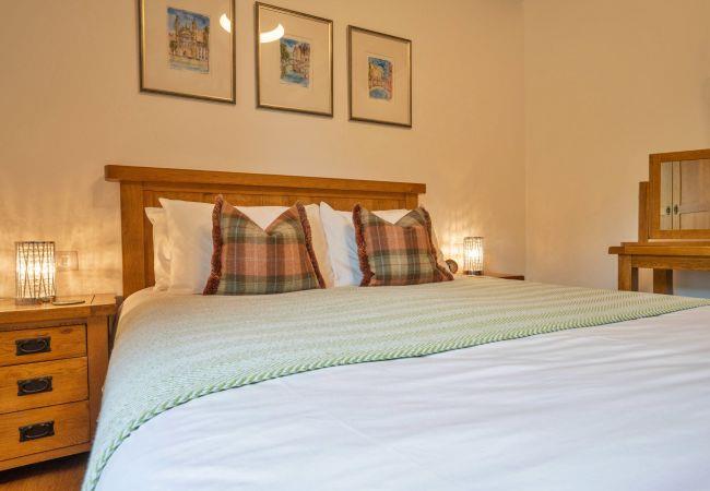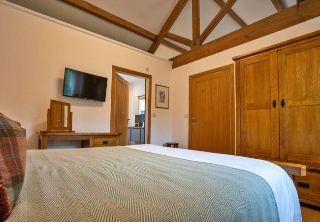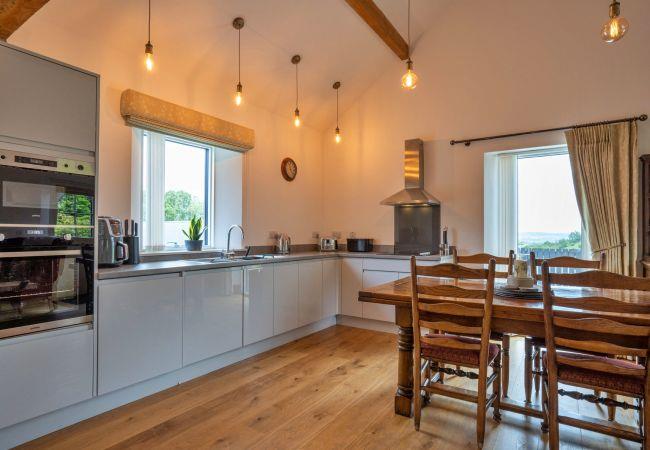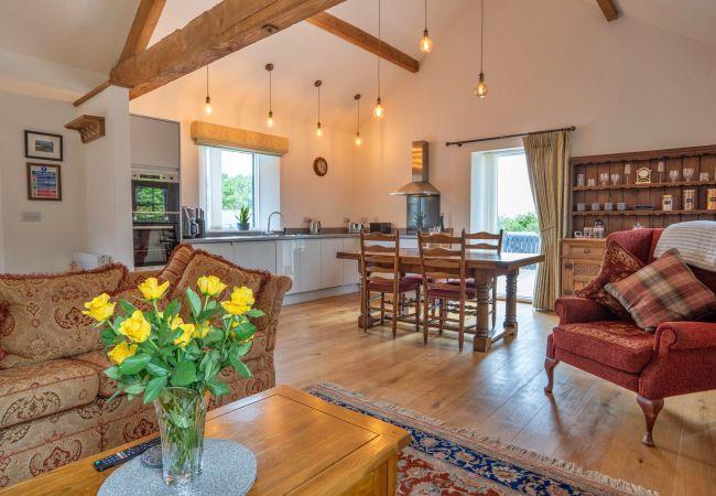 The open-plan living space is designed for relaxation, with a large comfortable sofas. On cooler evenings, the log-burning stove – with logs and kindling provided . The modern fitted kitchen comes fully equipped with quality appliances, cookware, and all the essentials for a home-from-home stay. The dining area, with its generous wooden table and four chairs. In the bedroom there is a king-size bed and a spacious en-suite bathroom boasting a double hand basin, heated towel rail, and a large shower for two.