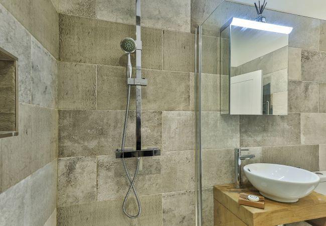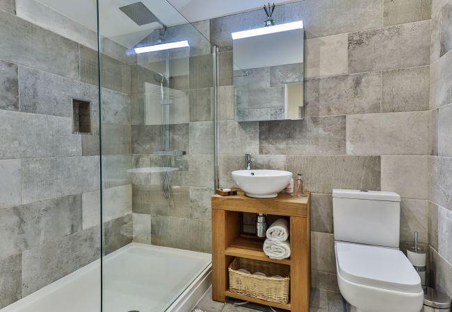 Upstairs, there are 2 separate bedrooms both with tasteful and stylish décor. The master has a super king-size bed, ample storage and a views out over the fields. The second bedroom offers great flexibility, with a full size single bed, and then the option of having an extra trundle bed if required, suitable to sleep a child. The bathroom is smart and modern, being fully tiled with a very generous sized walk-in shower enclosure complete with a large rainfall showerhead, basin and WC.