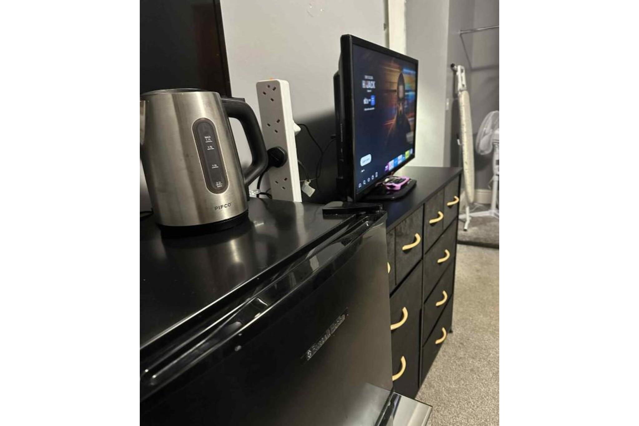Stueetage: (soveværelse(enkeltseng, enkeltseng, Fjernsyn, elkedel, mikrobølgeovn, køleskab, strygejern, Håndklæder inkl.), badeværelse(bruser, toilet, føntørrer)) Internetadgang, parkering,