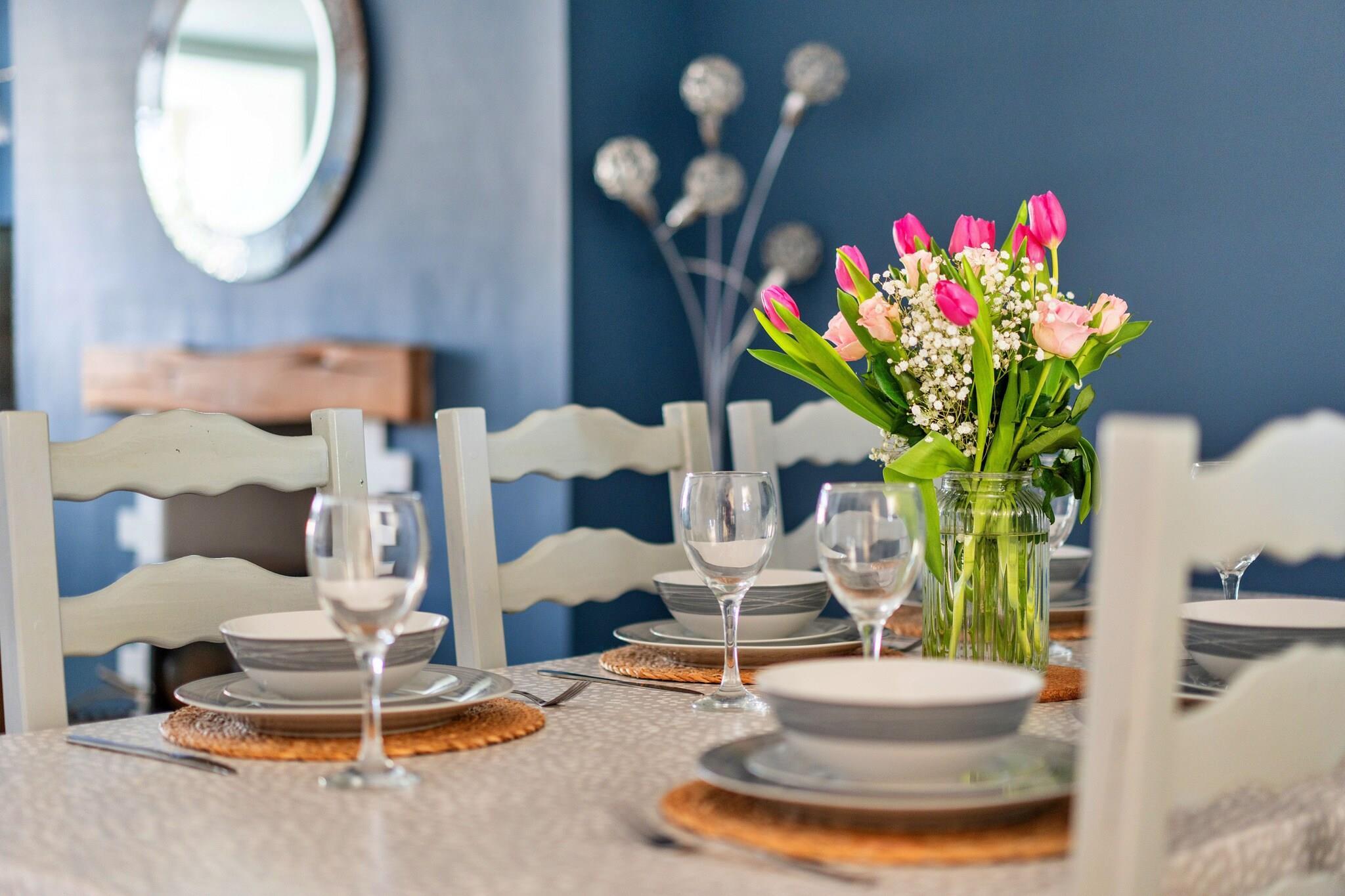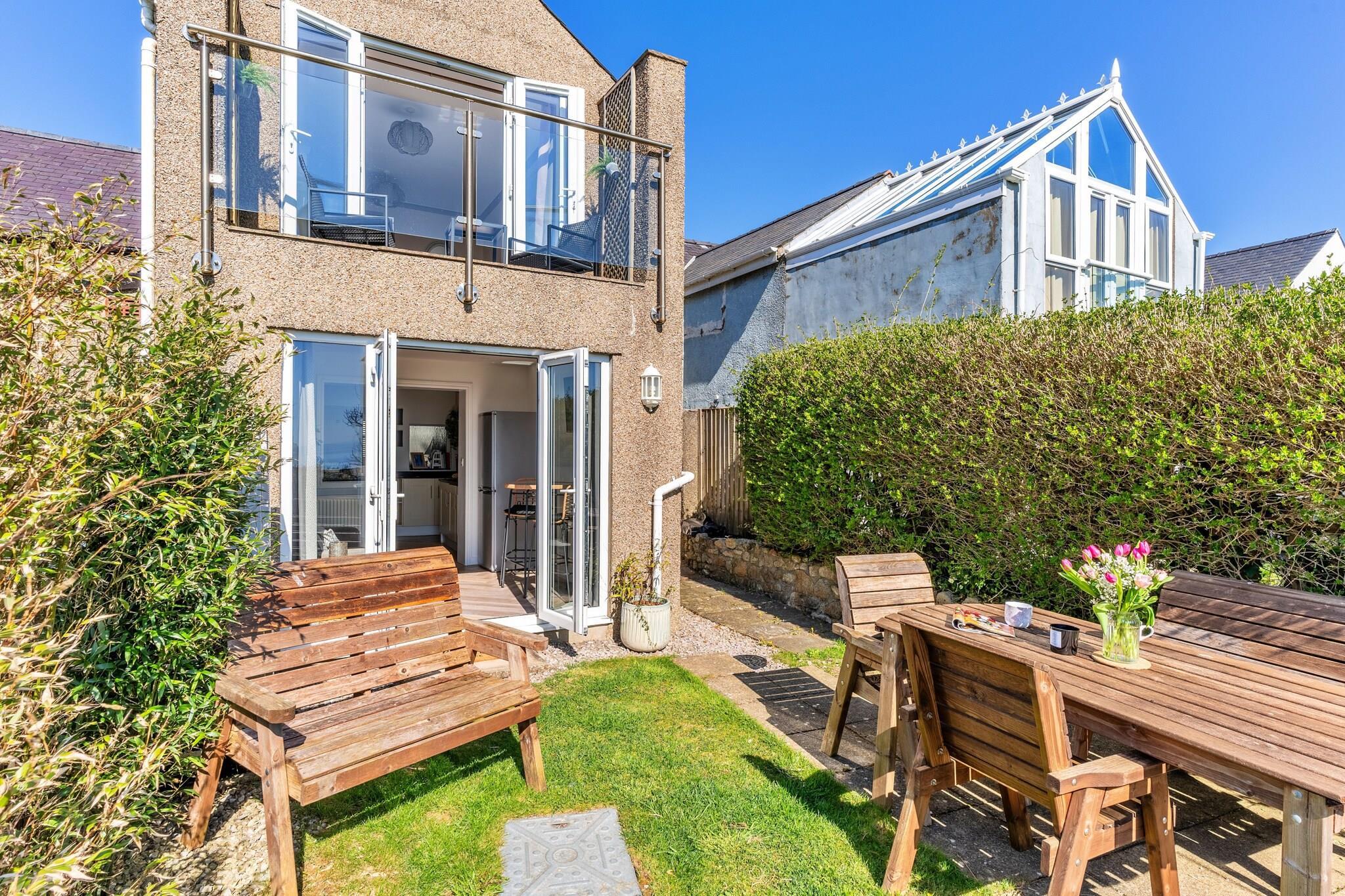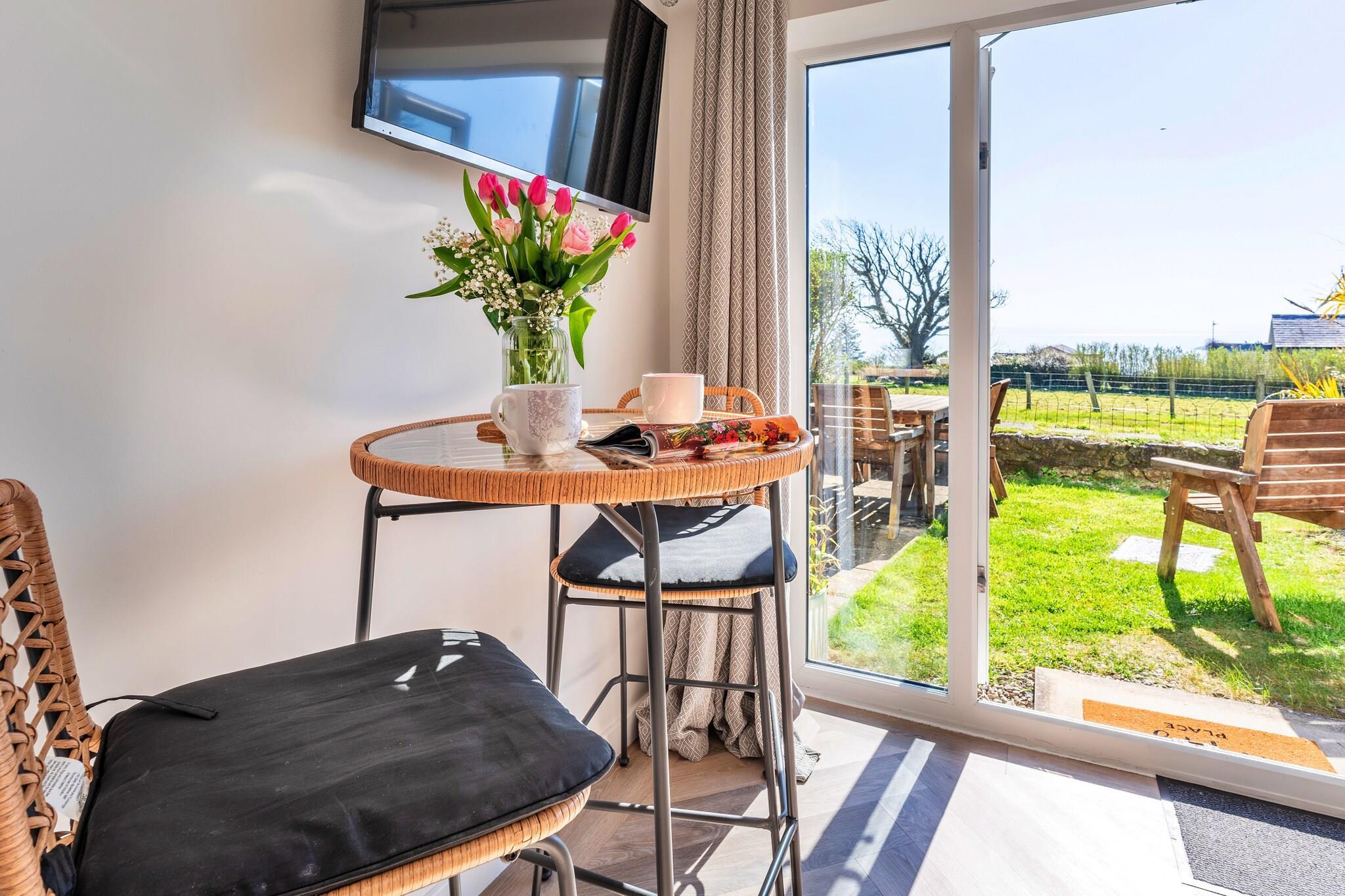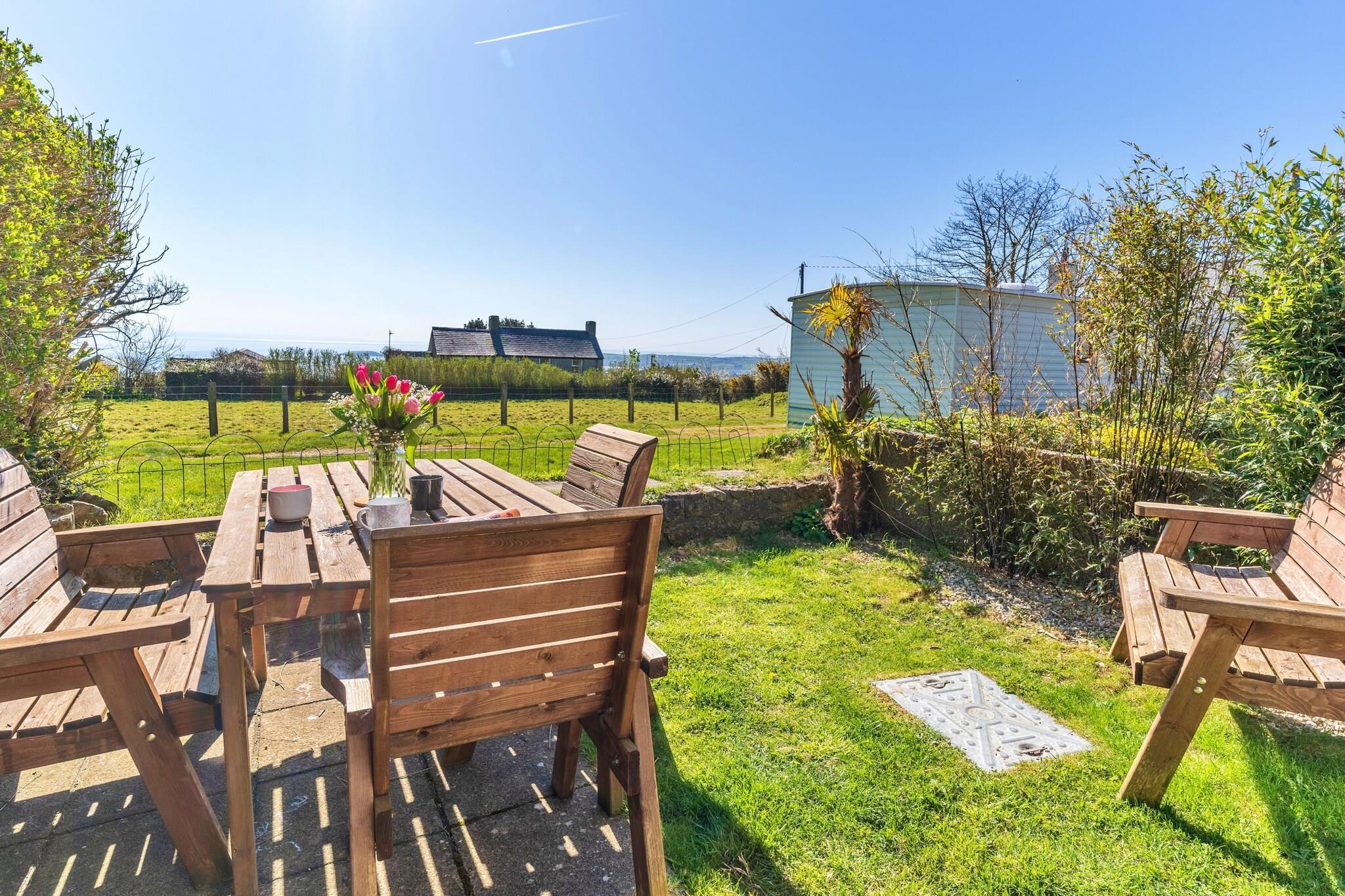 Dette dejlige hus, beliggende i den fredelige landsby Mynytho, kan rumme op til syv gæster fordelt på tre velindrettede soveværelser. Det rummelige soveværelse byder på en king-size seng og en privat balkon med betagende havudsigt. Et andet soveværelse har en dobbeltseng og en enkeltseng, mens det tredje værelse er indrettet med køjesenge, ideel til børn. Hjemmet er kæledyrsvenligt og tager imod en lille til mellemstor hund mod et ekstra gebyr. Gæsterne kan slappe af i solstuen, som åbner direkte ud i haven og giver et roligt udendørsområde til at slappe af. Mynytho, der ligger i det nordlige Wales, tilbyder den perfekte kombination af fredfyldt landskab og nem adgang til fantastiske kystattraktioner. Ejendommen har panoramaudsigt over Cardigan Bay og Snowdonia-bjergkæden, hvilket gør den til en perfekt base for udendørsaktiviteter. Vandre- og cykelstier er lige uden for døren, og de nærliggende strande, herunder Porthdinllaen, byder på muligheder for strandelskere at udforske. Lokale faciliteter, såsom butikker og caféer, er kun en kort gåtur væk, hvilket giver bekvemmelighed under dit ophold. Det fuldt udstyrede moderne køkken sikrer en behagelig selvforplejning, med alle nødvendige apparater til din rådighed. Den hyggelige stue med sin brændeovn tilføjer et varmt og indbydende touch, perfekt til at slappe af efter en dag med eventyr. Hjemmet har også Wi-Fi for at holde gæsterne forbundet. Familiebadeværelset, komplet med separat badekar og brusekabine, sikrer bekvemmelighed, mens et ekstra toilet tilføjer praktisk. Denne ejendom tilbyder et rummeligt og behageligt miljø for gæster, der søger både afslapning og eventyr.