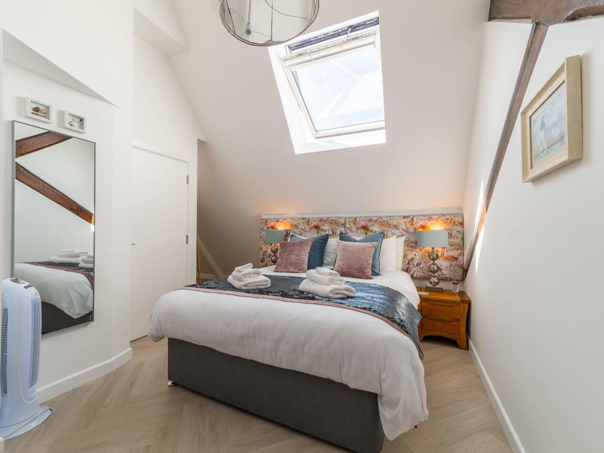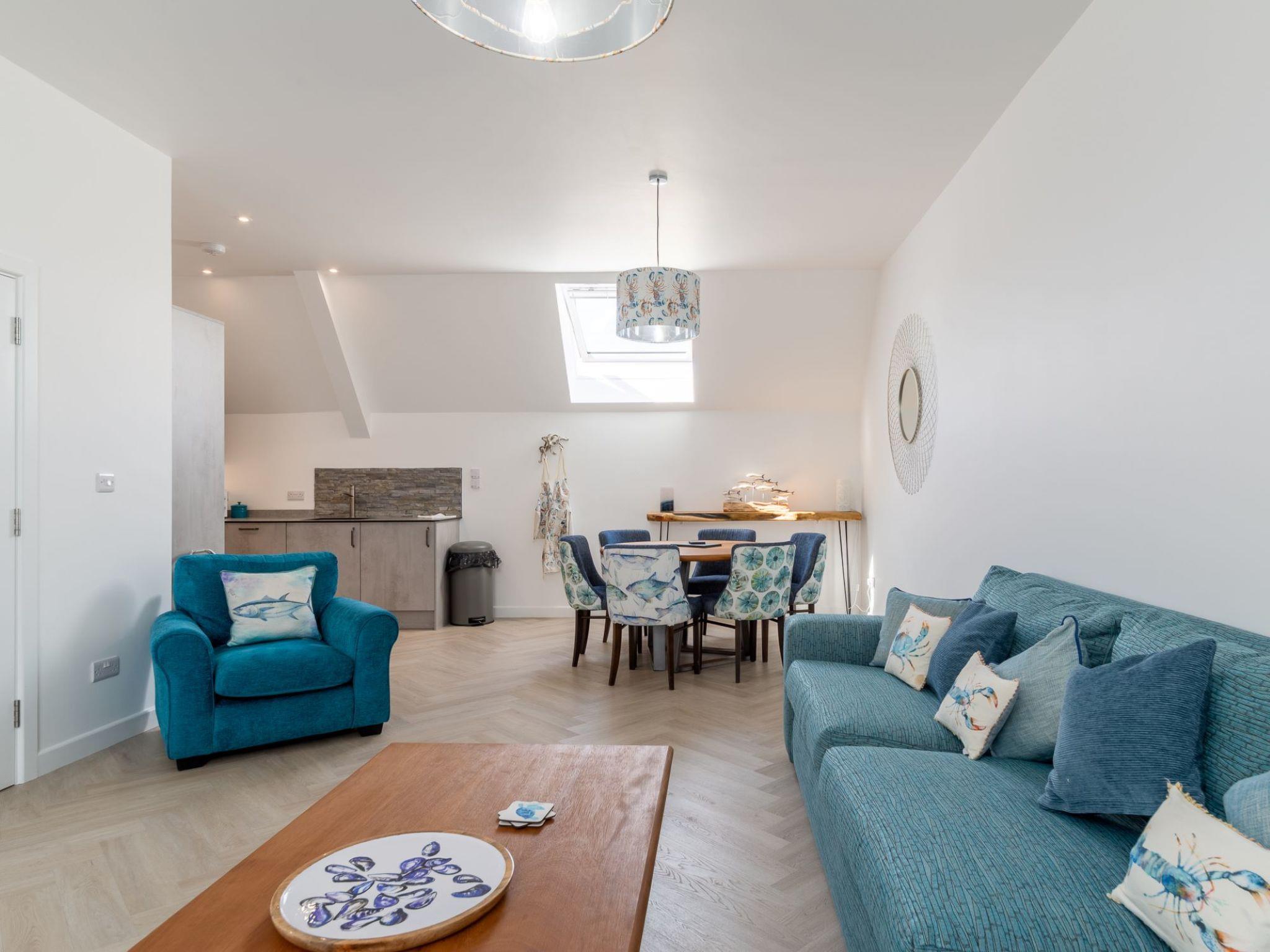 "Sun Trap", 4-room house 128 m2. Spacious and bright, fully renovated, luxurious and stylish furnishings: 1 large double bedroom with 1 double bed (2 x 75 cm, length 200 cm), bath/shower/WC and TV (flat screen). 1 large double bedroom with 1 double bed (2 x 75 cm, length 200 cm), shower/WC and TV (flat screen). Upper floor: large living/dining room with TV (flat screen). Large, open kitchen (oven, dishwasher, 4 ceramic glass hob hotplates, toaster, kettle, microwave, freezer). 2nd upper floor: 1 large double bedroom with 1 double bed (180 cm, length 200 cm), shower/WC and TV (flat screen). Terrace furniture. Partial view of the town. Facilities: washing machine, dryer, hair dryer. Internet (WiFi). Parking. E-charging station. Please note: maximum 2 pets/ dogs allowed. TV only EN. Smoke alarm. This apartment embodies boutique luxury living in the heart of Newquay.