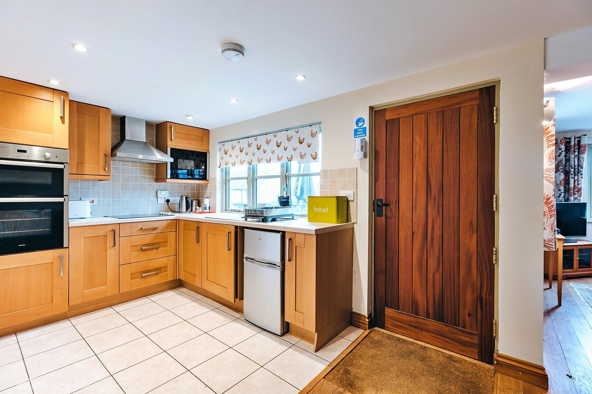 Flugt til Norton Cottage, et fredfyldt feriested i hele stueetagen beliggende i naturlig skønhed. Denne charmerende hytte med 2 soveværelser tilbyder en fredelig oase, perfekt til familier eller små grupper, der søger et afslappende ophold. Soveværelserne i king-size og to enkeltsenge er gennemtænkt designet, hvilket sikrer en afslappende nats søvn i rolige omgivelser. Et stilfuldt badeværelse med badekar, bruser og moderne bekvemmeligheder bidrager til dit opholds komfort. Hjertet af hjemmet er et åbent opholdsrum, der problemfrit integrerer et køkken, spiseplads og opholdsområde komplet med en brændeovn til hyggelige aftener. Køkkenet er veludstyret med moderne apparater, herunder en elektrisk ovn, kogeplader, mikroovn og køleskab/fryser, hvilket sikrer bekvemmelighed under dit ophold. Slap af og slap af med Freeview-tv, en dvd-afspiller og WiFi for underholdning og tilslutningsmuligheder. Udenfor kan du nyde naturens skønhed med et privat terrasseområde, perfekt til udendørs spisning eller blot at nyde omgivelserne. Gæsterne har delt adgang til en dejlig have med græsplæne og en hård tennisbane til rekreative aktiviteter. Rigelig off-road parkering sikrer en problemfri ankomst, mens yderligere familievenlige faciliteter såsom en rejseseng og højstol gør det til et ideelt valg for dem med små børn. Bemærk venligst, at ejendommen har en politik for forbud mod kæledyr og rygning, hvilket sikrer et fredeligt miljø for alle gæster. Book dit ophold på Norton Cottage for en foryngende flugt.
