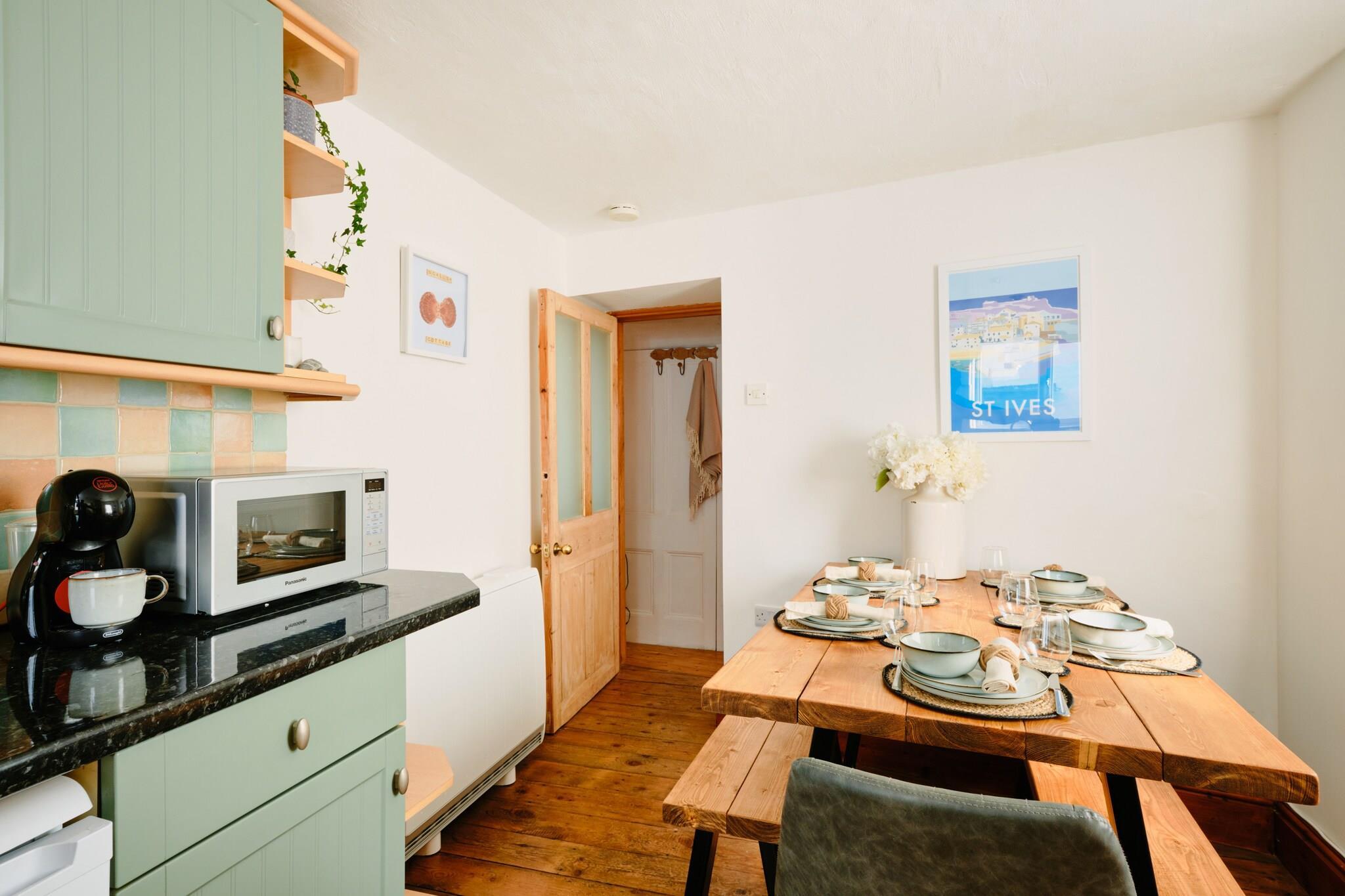 Dette sommerhus er en charmerende og nyrenoveret 3-værelses ejendom beliggende i hjertet af Porthleven. Dette historiske fiskerhus, der dateres tilbage til 1880, tilbyder en perfekt blanding af traditionelle træk og moderne indretning. Den rummelige stue har en hyggelig pejs med elektrisk brændeovn, der skaber en indbydende atmosfære, hvor gæsterne kan slappe af efter en dag med udforskning. Sommerhuset ligger kun en kort gåtur fra havnen, strande, restauranter og butikker, hvilket gør det til en ideel base for en ferie i Cornwall. Ejendommen kan rumme op til fem personer med to soveværelser med dobbeltsenge og et enkelt soveværelse, og er perfekt til familier eller små grupper. Placeringen af ??Scallop Cottage placerer gæster inden for rækkevidde af en række attraktioner. Porthleven er kendt for sin pulserende lokale scene med mange uafhængige restauranter, pubber og butikker at udforske. Gæsterne kan besøge den nærliggende National Trust-ejendom Penrose eller tage en kort køretur til attraktioner som Marazion og St. Michael's Mount eller udforske den fantastiske Helford Passage. Hytten er også godt placeret for adgang til smukke strande såsom Praa Sands, St Ives og Lizard Peninsula, der tilbyder noget for enhver smag, fra vandsportsentusiaster til naturelskere. Indenfor byder hytten på et veludstyret køkken i shaker-stil med en fuld ovn, kogeplader, mikroovn og køleskab med fryser, ideel til at tilberede måltider. Spisepladsen er integreret med køkkenet, hvilket giver et socialt rum for gæster til at nyde måltider sammen. Familiebadeværelset på første sal har et badekar med bruser over hovedet, en stor håndvask og et toilet. Et privat udendørsområde på bagsiden af ??ejendommen giver plads til opbevaring af strandudstyr eller surfbrætter, hvilket sikrer, at du er klar til endnu en dag ved havet.