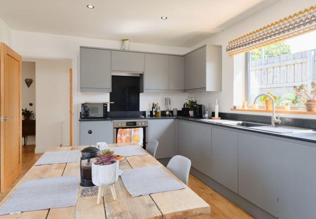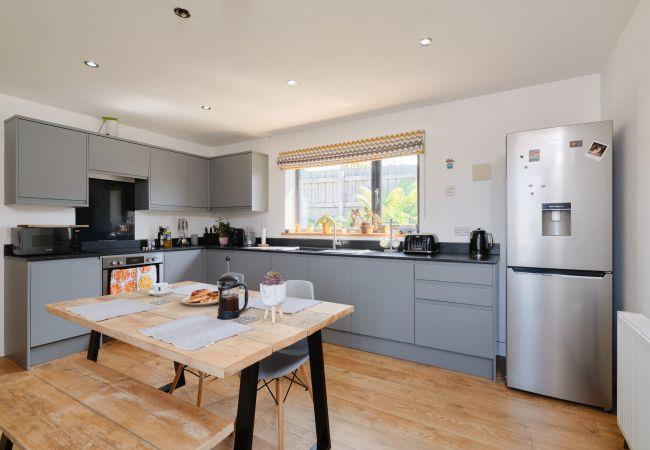 The living room has a huge leather corner sofa to sink into, large TV, and beautiful wooden flooring in-keeping with the coastal feel. The kitchen is excellently appointed, with large fridge freezer, full size oven, dishwasher, washer dryer and plenty of storage space.