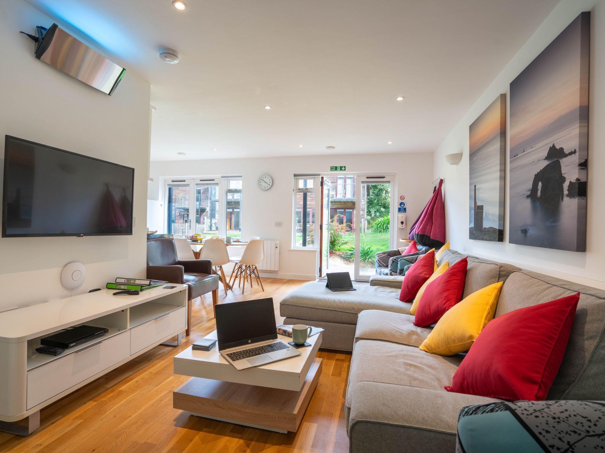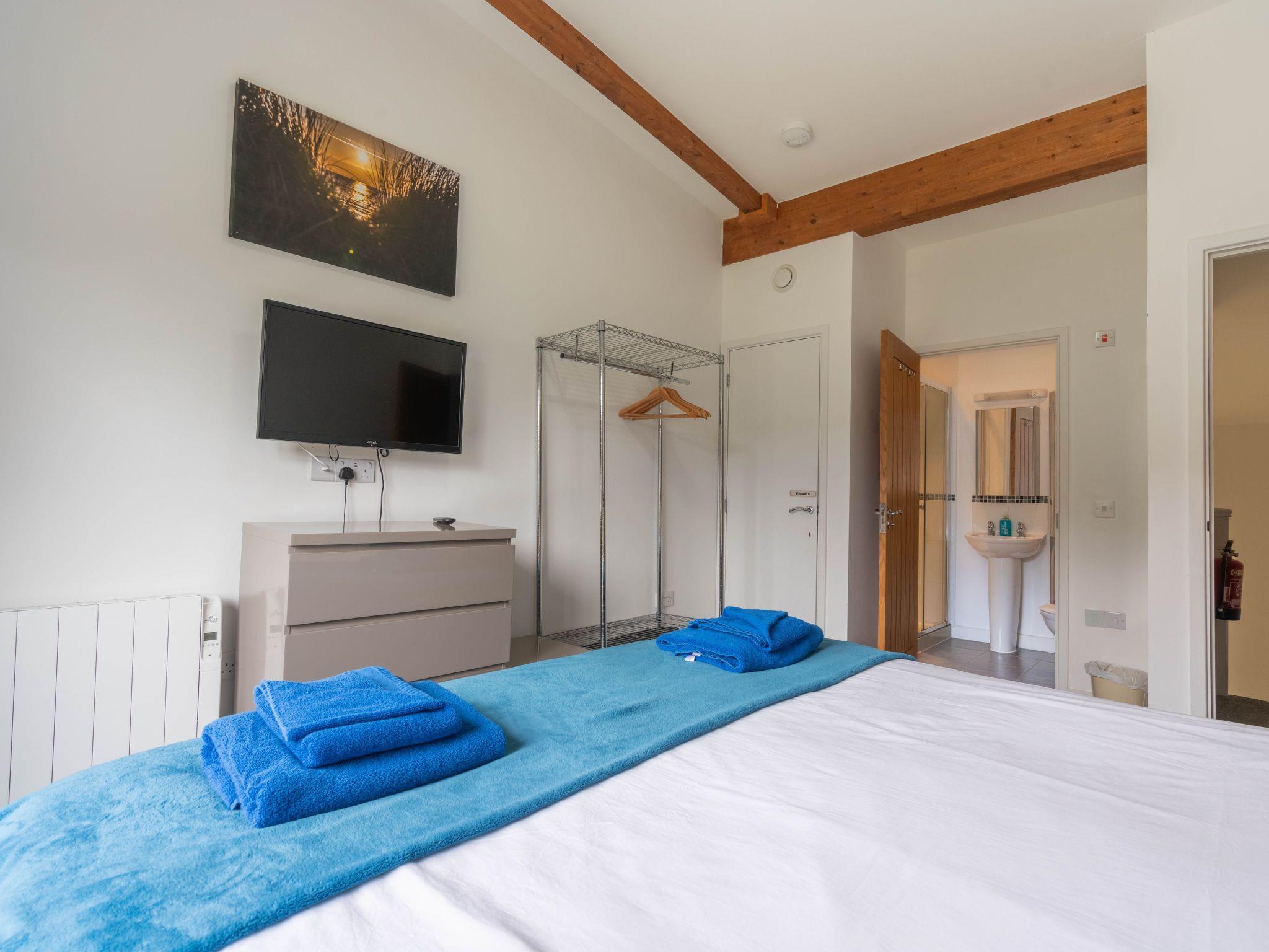 Inside this opulent open-plan beach house, guests are greeted with a plethora of modern conveniences designed for comfortable living. The ground floor hosts a double room with Kingsize bed and an en-suite shower room, catering seamlessly to guests requiring easier access. The living spaces are woven together with free Wifi, a smart TV for entertainment, and a fully equipped kitchen that includes a fridge/freezer, washer/dryer, toaster, microwave, and dishwasher. This area represents a perfect fusion of modernity and comfort, designed to make your stay as enjoyable as possible.