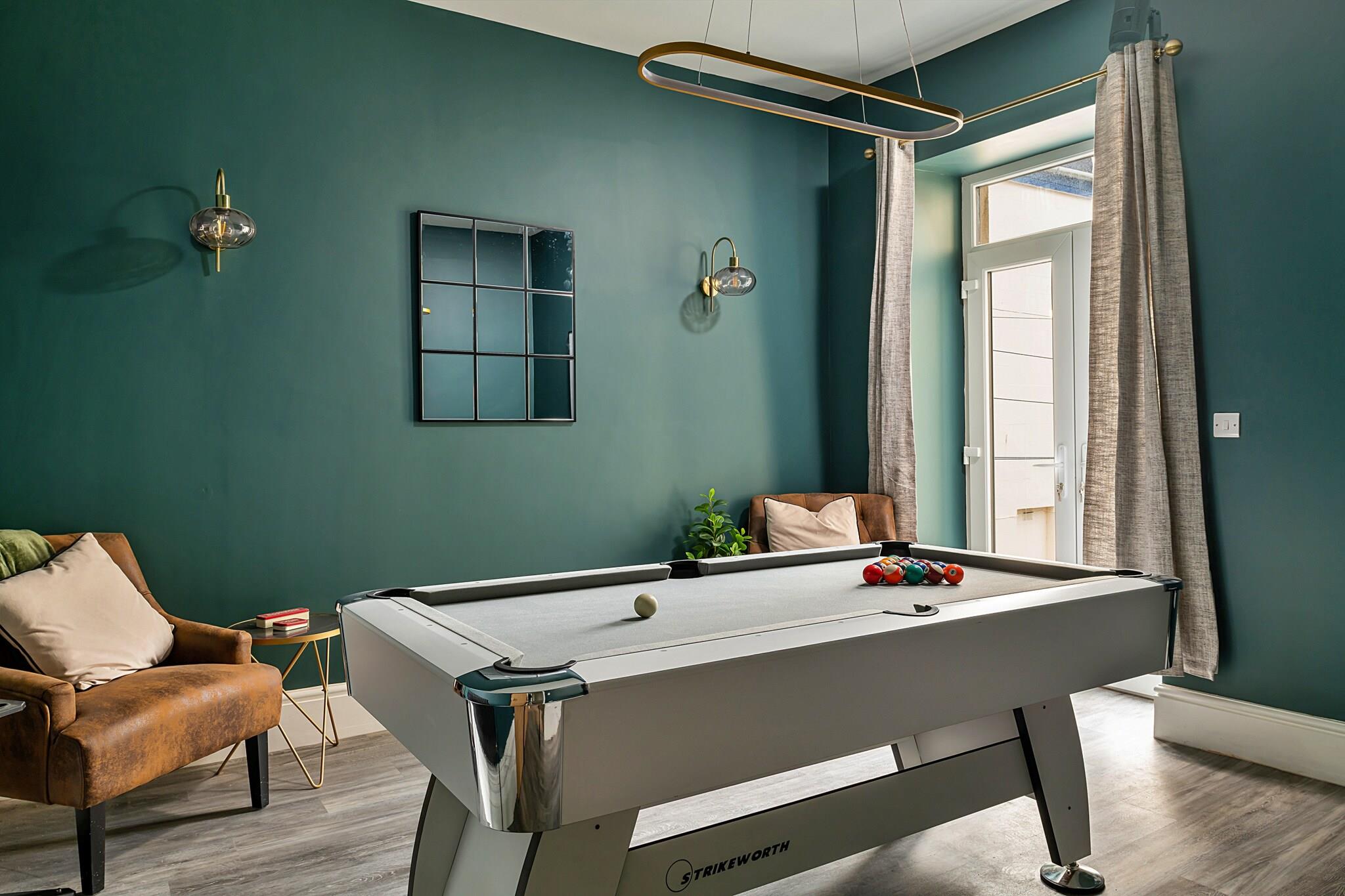Stilfuldt og moderne, Sea View Retreat i Pwllheli tilbyder et rummeligt feriehus for op til 15 gæster, perfekt til familier og venner, der søger en afslappende ferie ved havet. Denne moderne ejendom ligger kun 500 meter fra Blå Flag-strande og har to lejligheder på fire etager. Stueetagen sover fire med et åbent køkken og opholdsstue, to soveværelser med dobbeltsenge og et familiebadeværelse. Lejligheden på første sal har plads til 11 gæster med en stor stue med en elektrisk pejs, Smart TV med Sky og WiFi. Det fuldt udstyrede køkken har en elektrisk ovn, induktionskomfur, mikroovn, kaffemaskine, køleskab, fryser, opvaskemaskine og en vaskemaskine/tørretumbler, hvilket gør selvforplejning praktisk. For nylig renoveret med komfort i tankerne, indeholder hjemmet et spillelokale med et poolbord og brætspil for alle aldre. Døre fører fra spillelokalet til en solterrasse med spabad, perfekt til at slappe af ved solnedgang. Første sal har tre soveværelser med dobbeltsenge (to med en-suiter), et enkeltværelse og et familiebadeværelse, mens de øverste etager har to ekstra soveværelser med dobbeltsenge med eget brusebad. Off-road privat parkering er tilgængelig på bagsiden af ??ejendommen, selvom adgang til de øverste etager er via trapper, da lejlighederne spænder over fire niveauer. Udforsk Pwllhelis livlige bymidte, fuld af pubber, caféer, butikker og lokale spisesteder, der serverer walisiske specialiteter som prisvindende fish and chips. Byen er en ideel base for at udforske Cardigan Bay og Det Irske Hav, med muligheder for kystkrydstogter for at se sæler, havfugle og delfiner. Uanset om du slapper af i spabadet, slentrer langs stranden eller opdager det lokale landskab, tilbyder Sea View Retreat en stilfuld kystflugt til en uforglemmelig ferie.